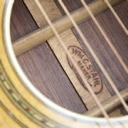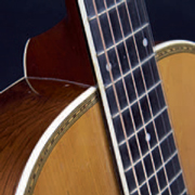 The X-bracing is set back and built as a laminate with Brazilian rosewood as the core material sandwiched between two bits of spruce. What an amazing concept! As a result, the top is perfectly flat with no stress deflection or cracks. The neck is a modified V with a 1 3/4” nut: a fingerpicker’s dream. Tonally, the guitar is simply amazing. Not huge, but sublime, with subtleties rarely heard in any guitar.