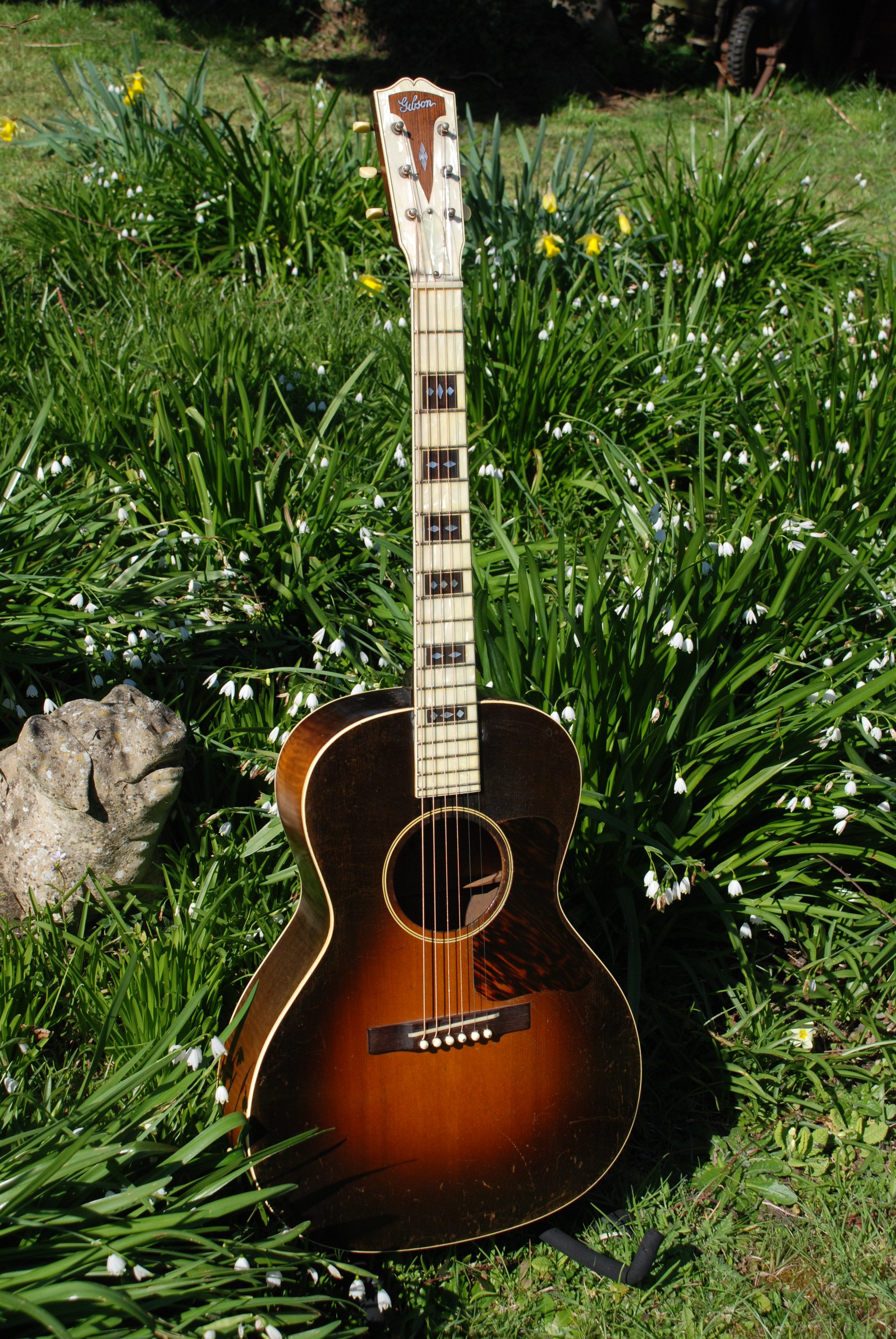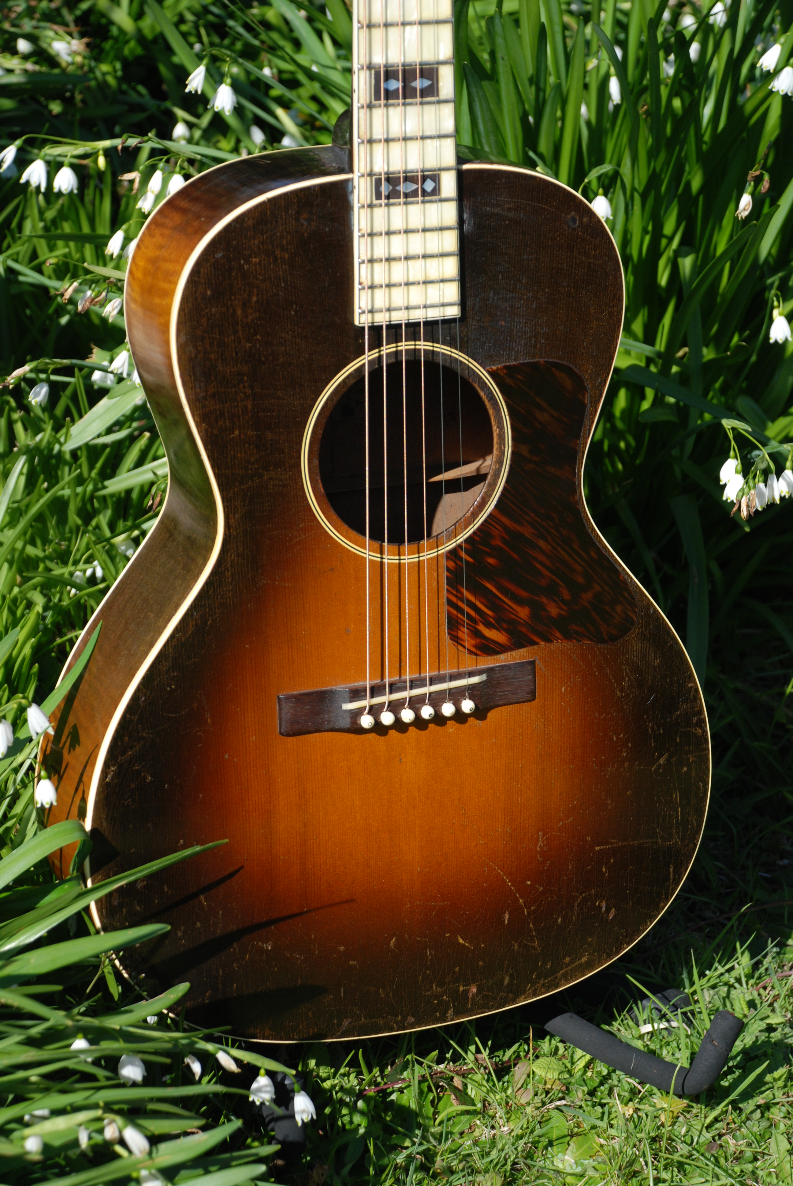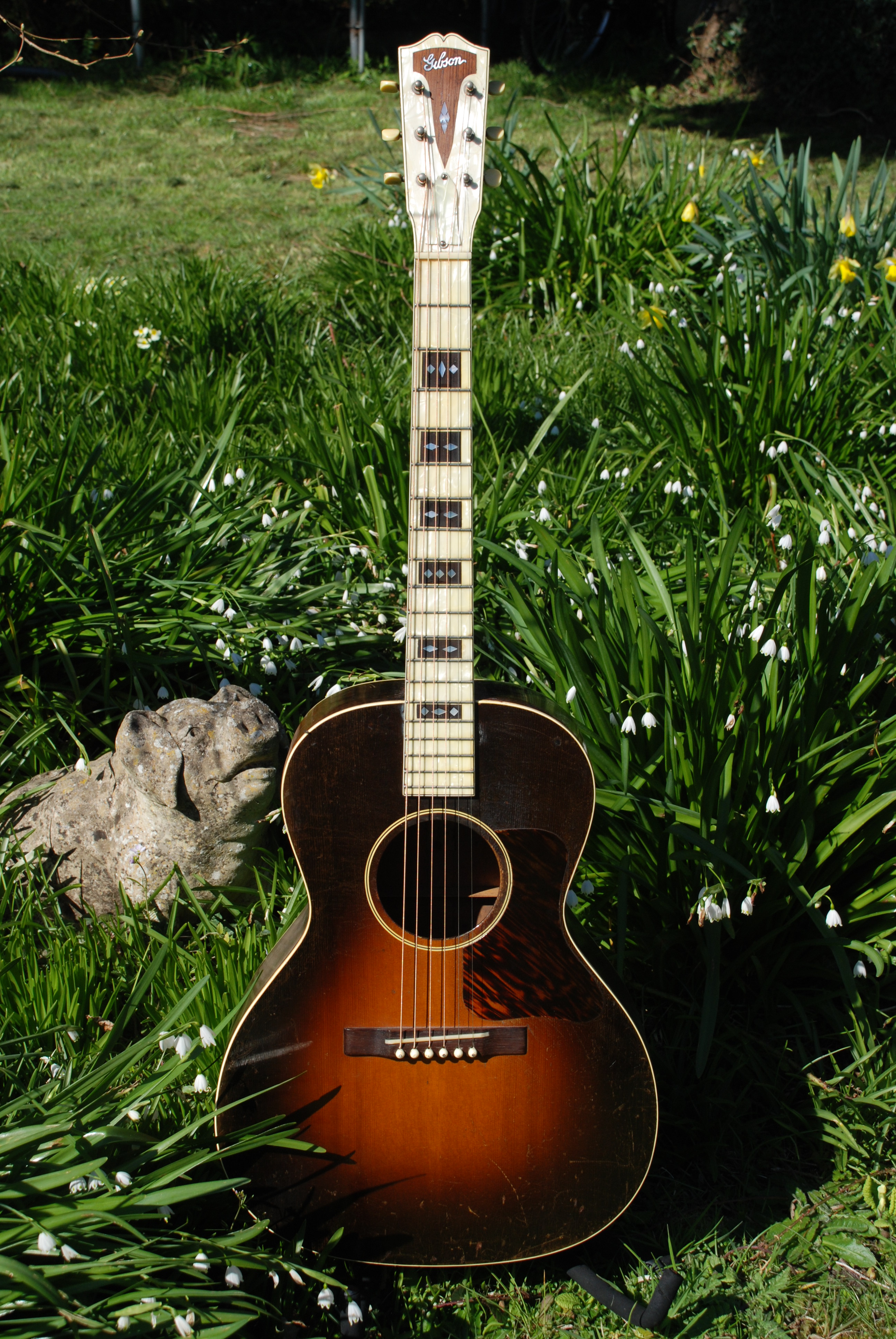 You just have to look at this guitar to fall in love. What a magnificent color and patination......and that small burst. An amazing machine from all perspectives. All original and in exceptional condition it's a gem of it's model. Burst painted maple body and Adirondack spruce top, mahogany neck and that lovely Mother of Toilet Seat veneered fingerboard. It's very articulate and mature, not far from my lovely Nick Lucas from the same moment. Crisp and clear with lots of power and that thumpy bottom end we all love in a blues guitar. It does everything well and is a marvel to play.