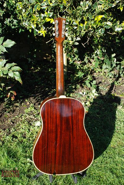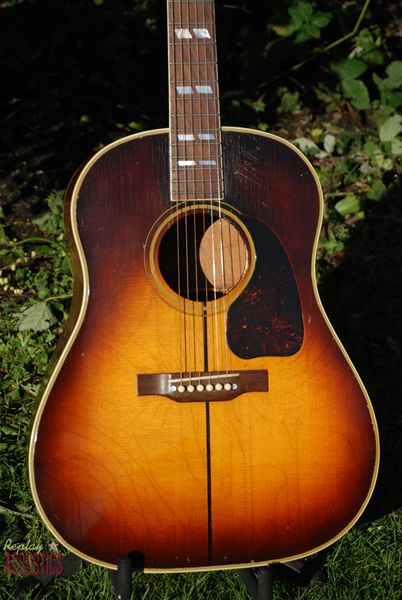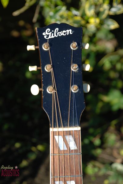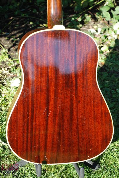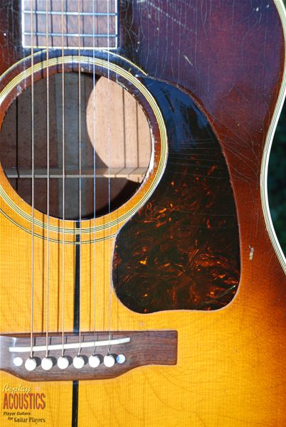 It's in all original and exceptional condition....first state......with a unique mix of wartime features. It has a fat, 1 7/8ths inch bound five piece neck with a full C radius and no truss rod. The neck heel has the white heel cap and the front soundboard has the reknowned "skunk stripe" down the center seam that was used to disquise a seam slightly off center and found only in the very early examples of the SJ. Importantly, it bears the white silkscreen "Gibson" script logo that traditionally pre-dates this era and is extremely rare if not unknown on other dreadnought models of the war period. Usually found on the J-35 and early L-00's, this logo had basically disappeared by now with the "banner" headstock logo being the war time moniker.