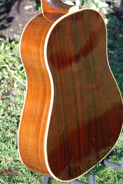 I have often wondered how Gibson traversed itself from the incredible rosewood Advanced Jumbo to the mahogany bodied SJ/J-45 of the wartime era. This guitar represents the link between the two and shows us a glimpse of the thinking inside the Gibson factory at the outbreak of the war in America. They finally fall upon maybe their most incredible guitar ever, only to be thwarted by the calamity of World War II. The conflict possibly played a part in spelling the death knell of this hybrid rosewood SJ and forced the emergence of the mahogany bodied examples we have all come to know and love. But goodness, what they left behind on the cutting floor. We can only glimpse it here in this rare and wonderful example of the early war Southern Jumbo.