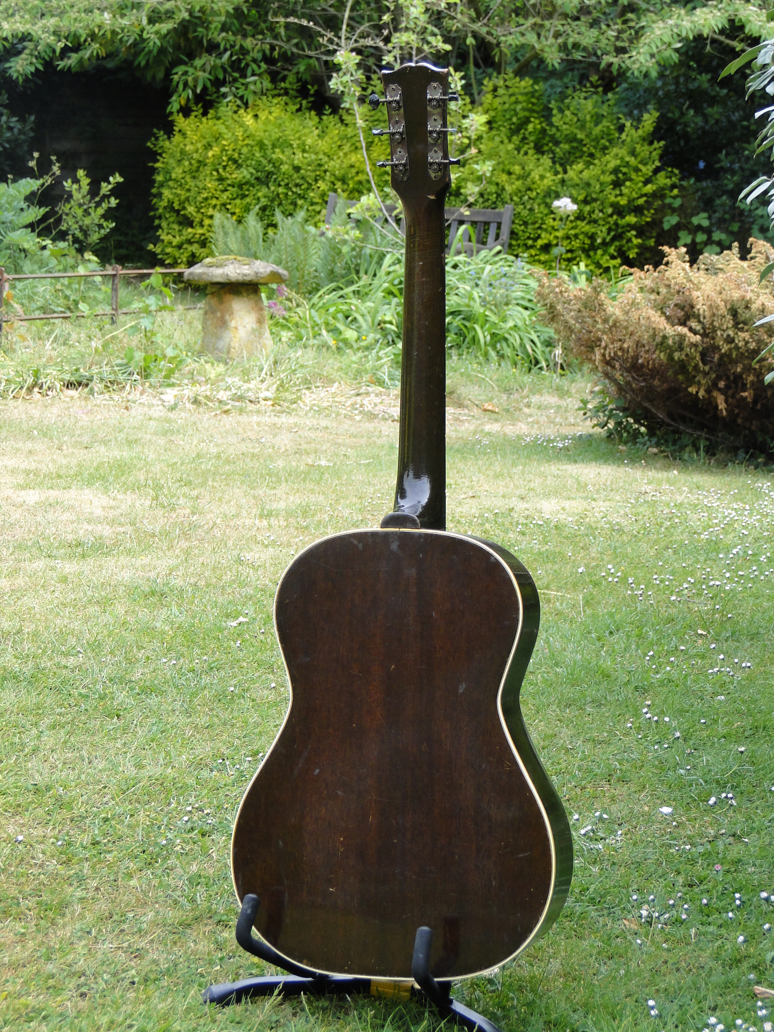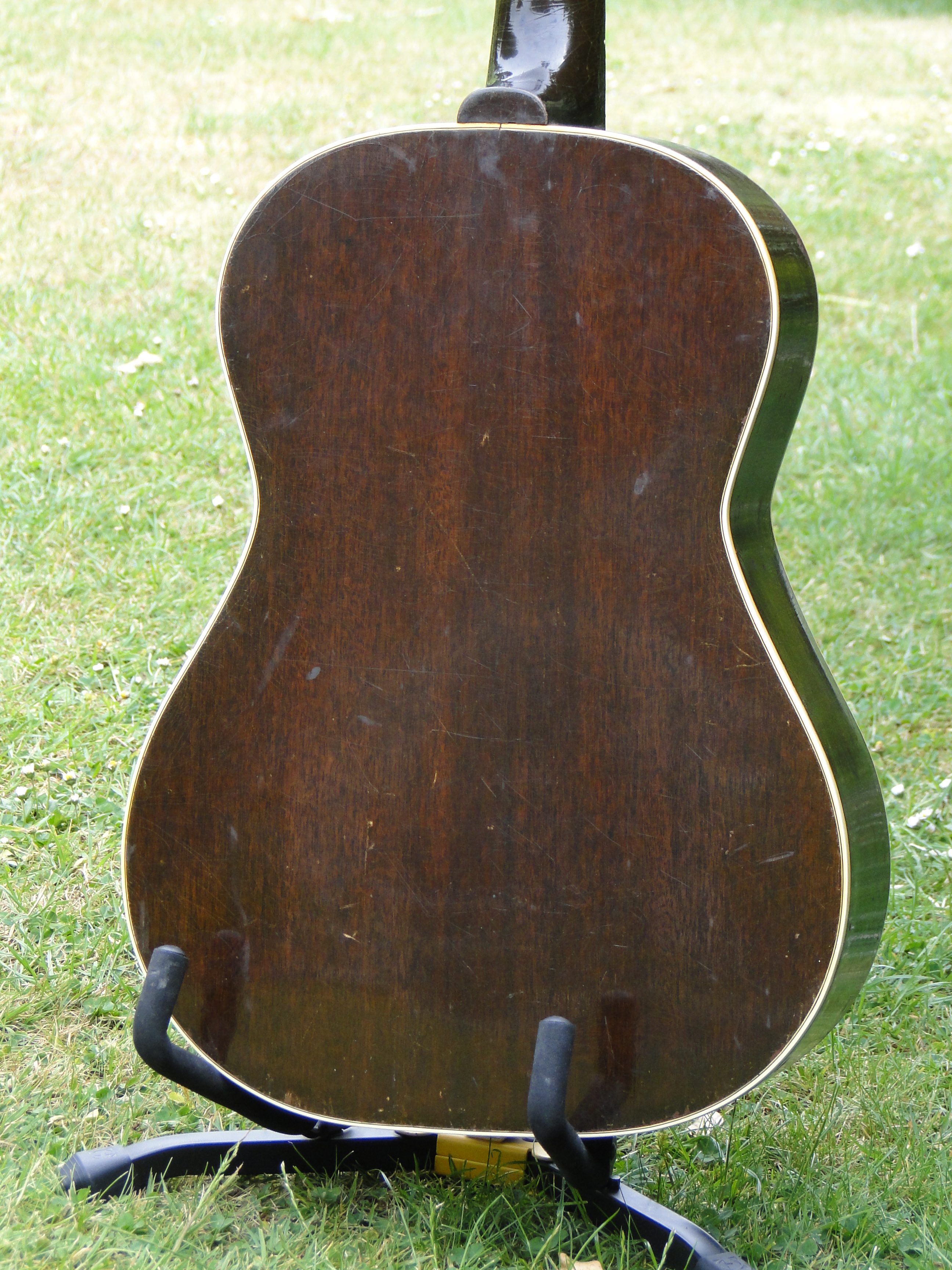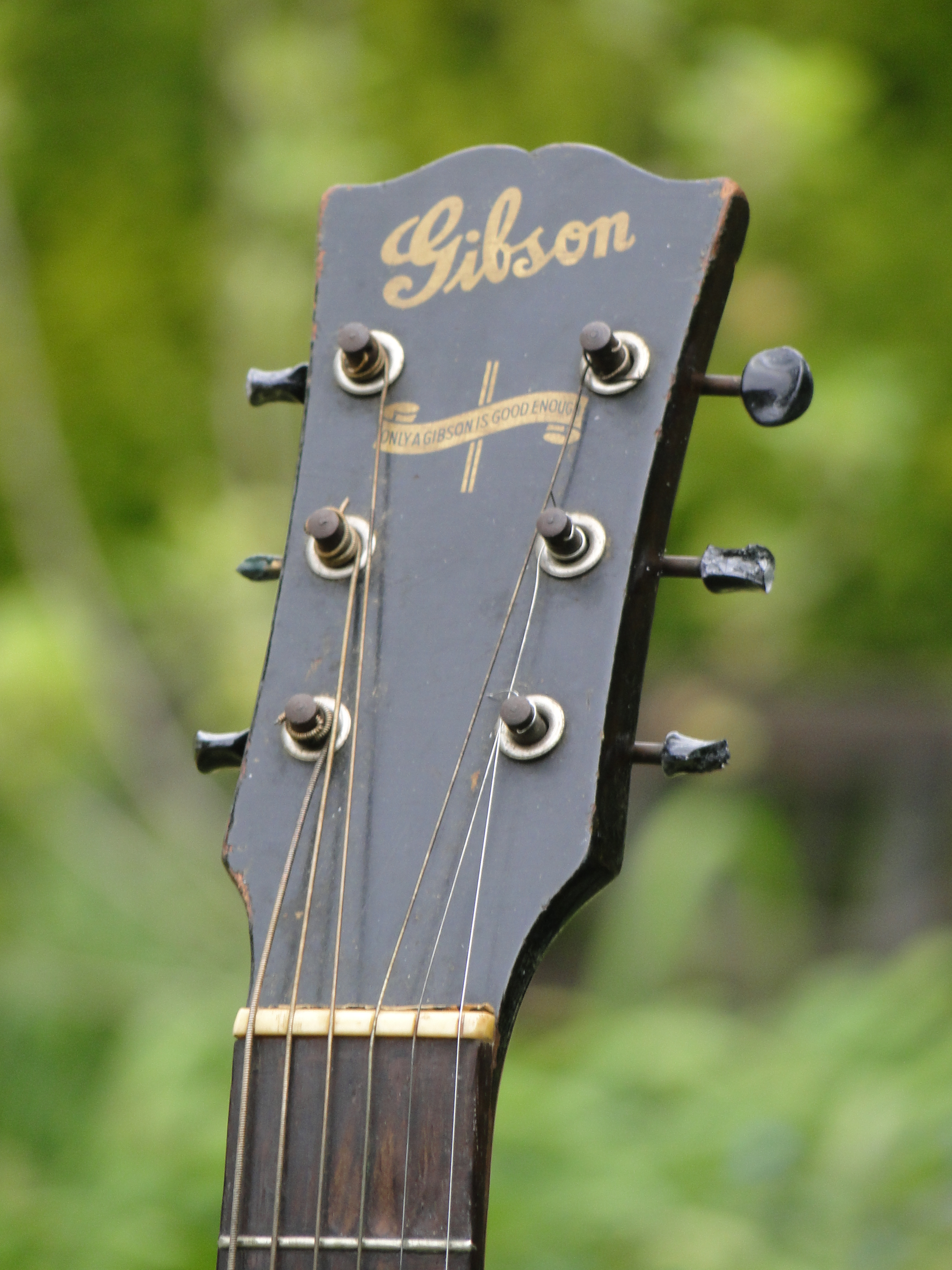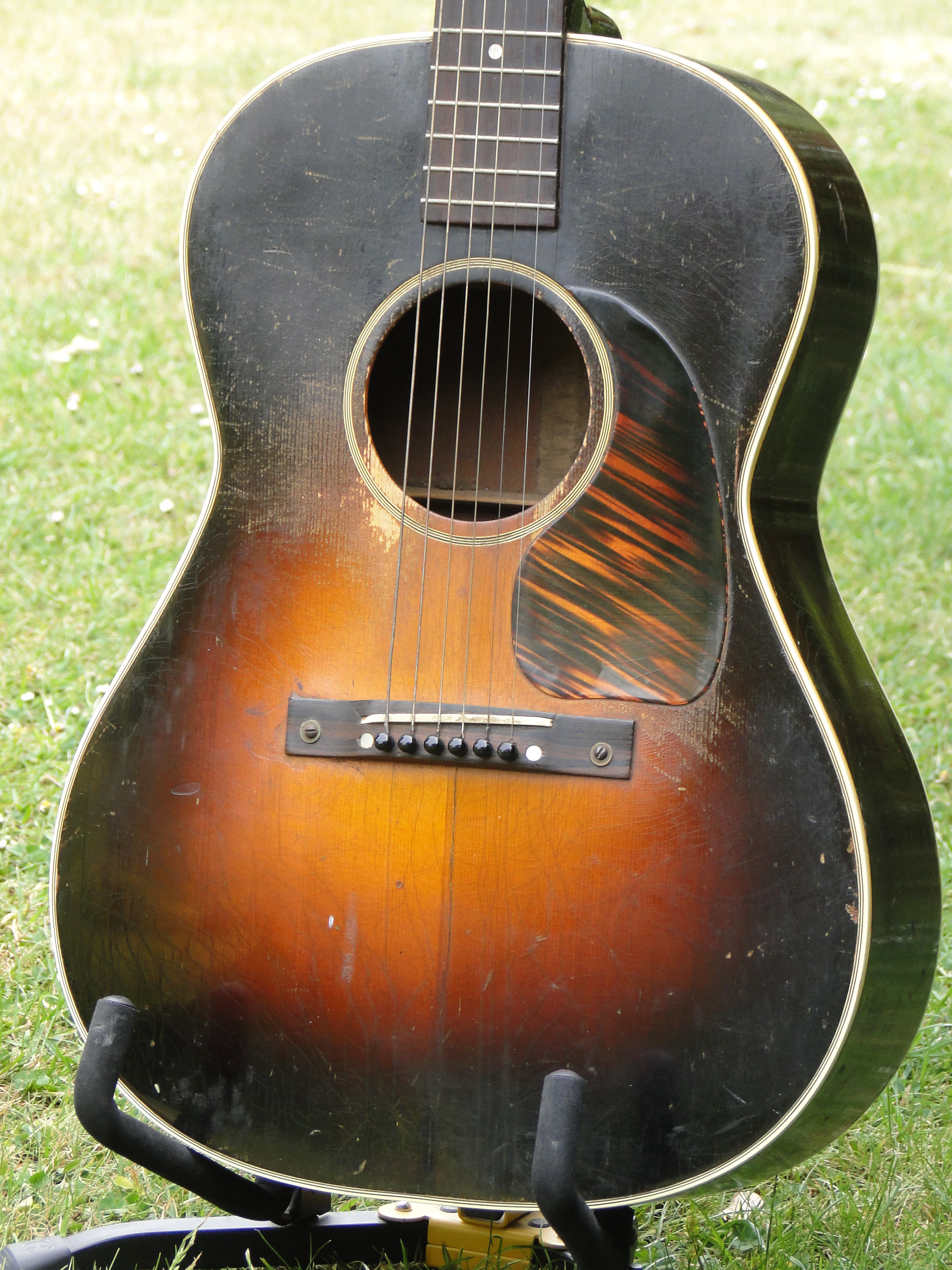 The pics for this listing are the originals that I took way back when I owned this the first time. Before it went, we neck set it, took the bolts out of the bridge, replaced the tuner buttons and presto !!! But what a great example of the LG 2 war period guitar. It's pretty much untouched other than our efforts to keep it all together back 6 or 7 years ago. Staggeringly beautiful pick guard and crusty tuner plates. The burst finish is like a deep hole and overall, this old gal has held up her end and still has loads left in her. Powerful voice that is quite surprising for an LG-2.......bright and crisp with layers of harmonics and great sustain. Not your typical banner LG-2 by any means.