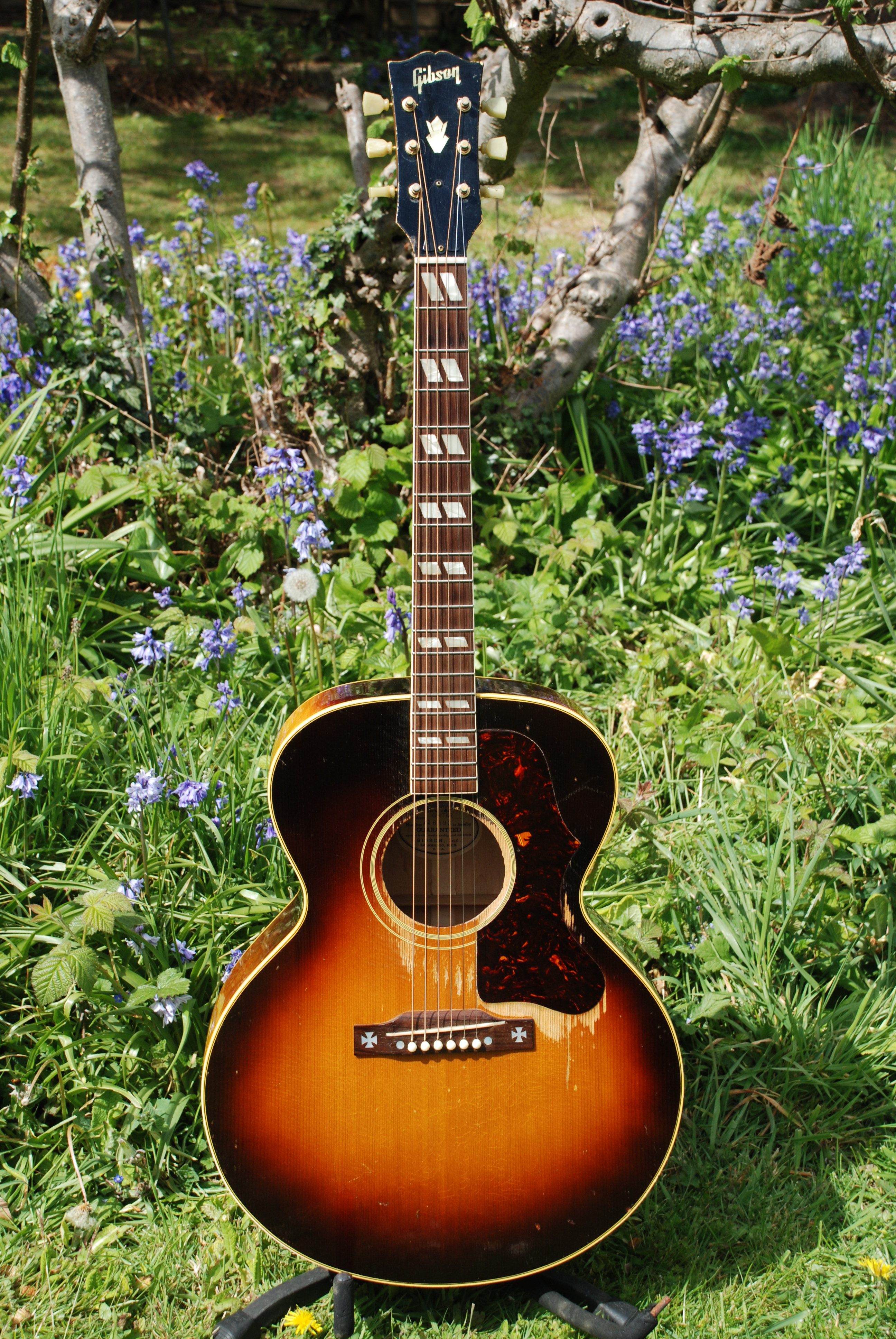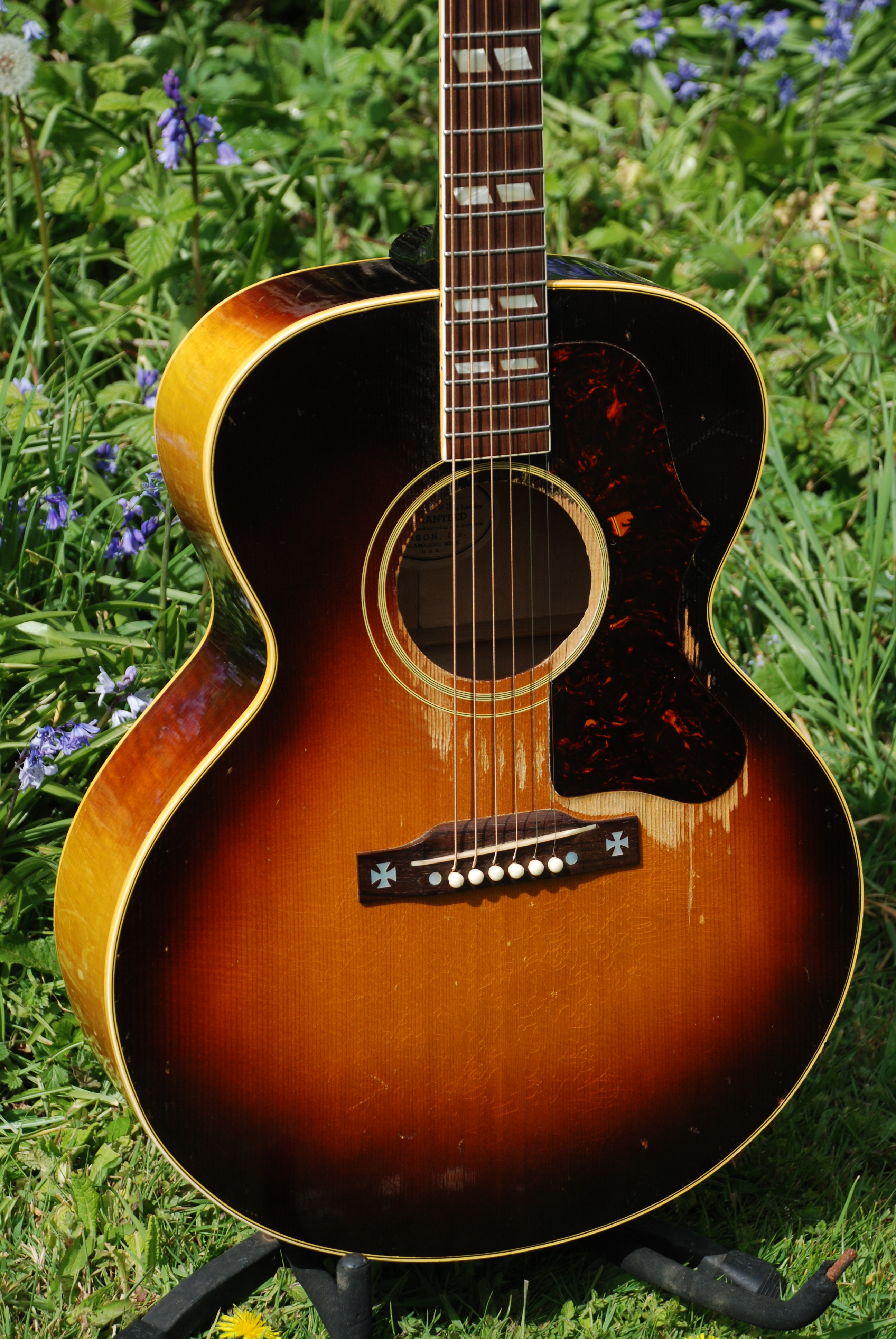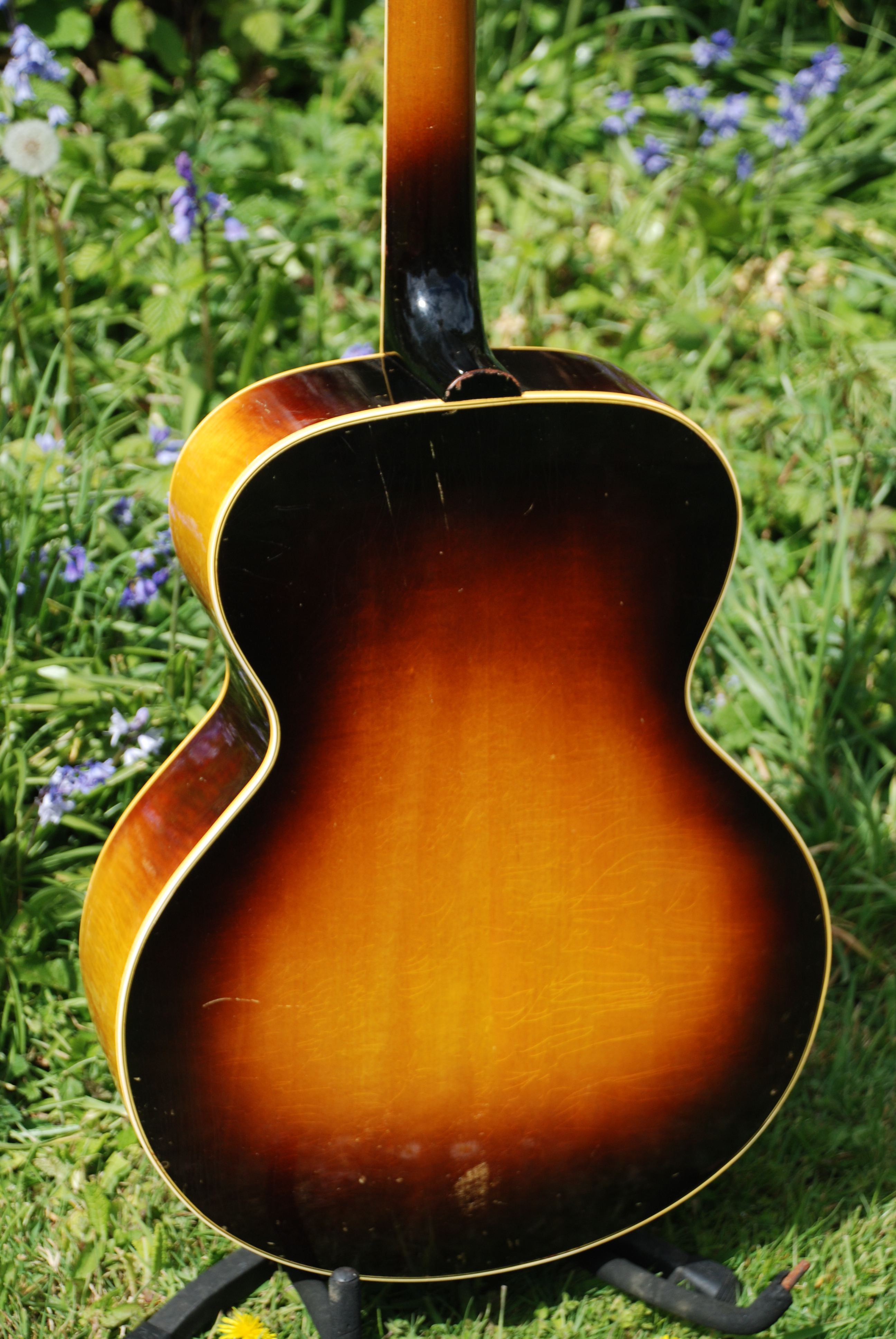 So few of these were ever made. Starting in 1951 and running thru 1959, this year saw only 151 examples built. The real beauty of this year and the years preceding it is that they had 2 tone bars instead of 3 which leaves the top looser and the tone really fully developed and powerful. The bracing was tall and scalloped until 1955 when they changed to shorter, non-scalloped which changed their voice. Still good guitars but the early pre-1955 examples are exemplary. It's also the first Gibson to use this style of pickguard. Fully sunburst finish including the sides and back, it was Gibson's most expensive guitars of this period after the J-200. Needless to say, this is a superb example. Solid Michigan sugar maple is used on the rims and back with a Sitka spruce top and a maple neck as well. It's all original and has a perfect set up, ready for stage and screen. And they come along so seldomnly you might not see another for sale in this country for a long while.