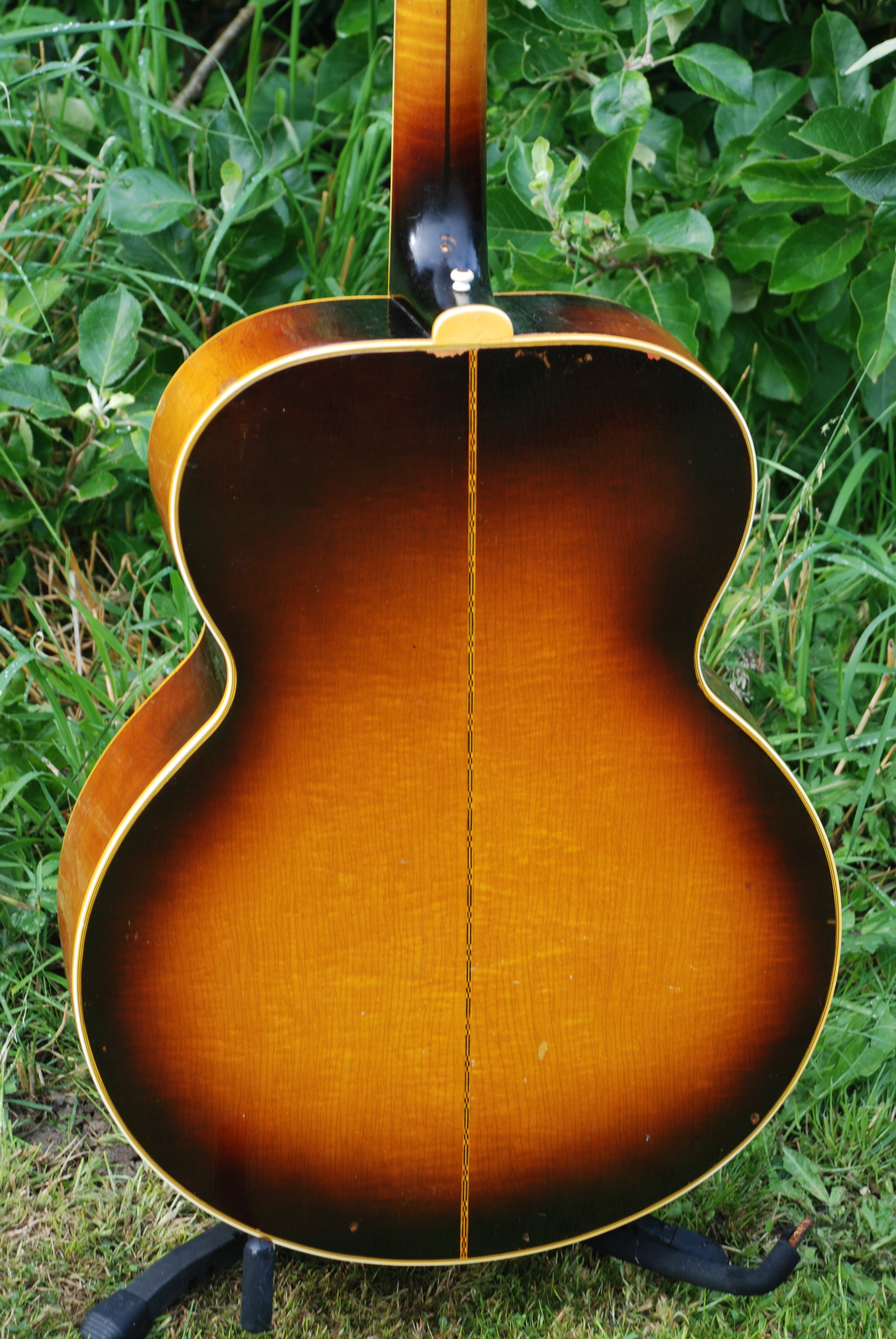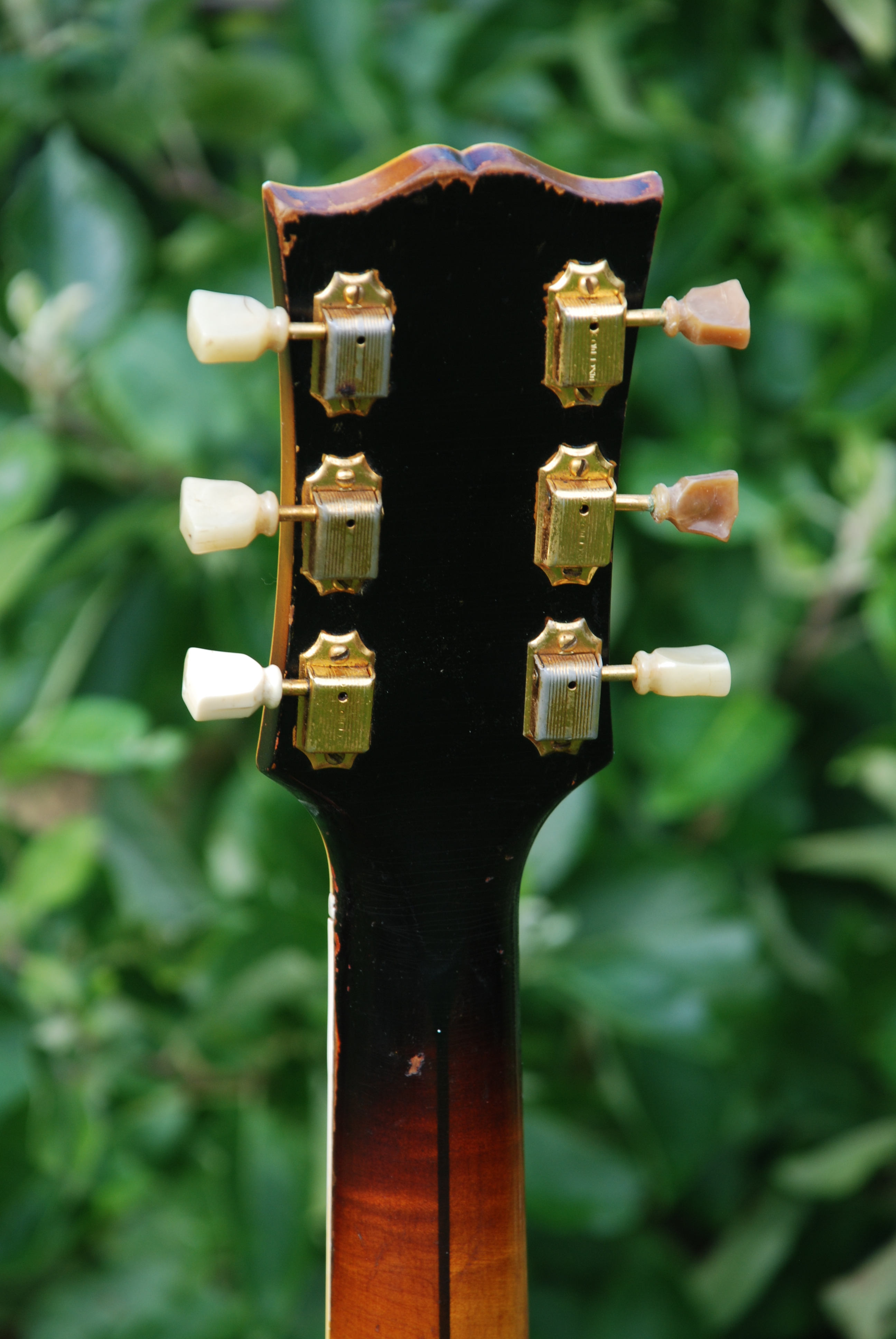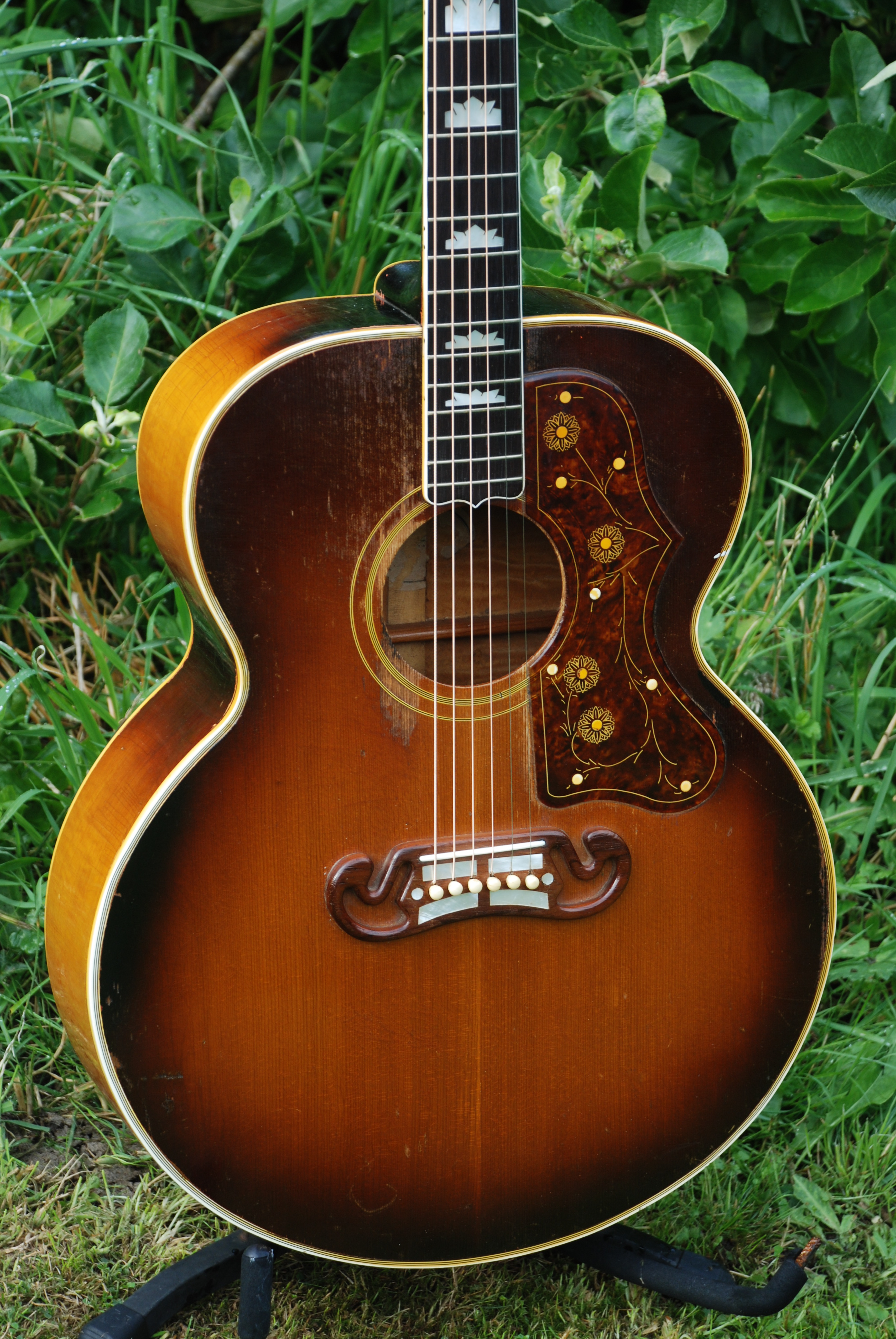 Classic Gibson SJ-200 with a beautiful tobacco burst finish and in exceptional condition. These old behemoths are becoming difficult at best to find and this one is a real treat to see and play. Very characterful patination and craqeuleur throughout the guitar with a bit of playwear around the soundhole and some minor finish gone at edges, all making it a very charming instrument to hold. All original excluding three tuners. The originals are no-line and there are 3 of those with 3 single line 1958 generation tuners replacing ones that are in the case. So very little to mention and most importantly, the sound is fantastic. Big, and I do mean big bottom end with good note separation and clarity and an even balance in the sound range. Classic maple bodied tone with lots of power and resonance. Later on, in the 60's these are called "whispering giants" after market pressure instilled changes in their bracing that basically killed them for sound. I've always scratched my head about the decision by the owners of Gibson in the late 60's to make a guitar that had little sound, seeing as how it's meant to do just that. But these early examples are no shrinking violets......Emmy Lou Harris would agree with that !!!