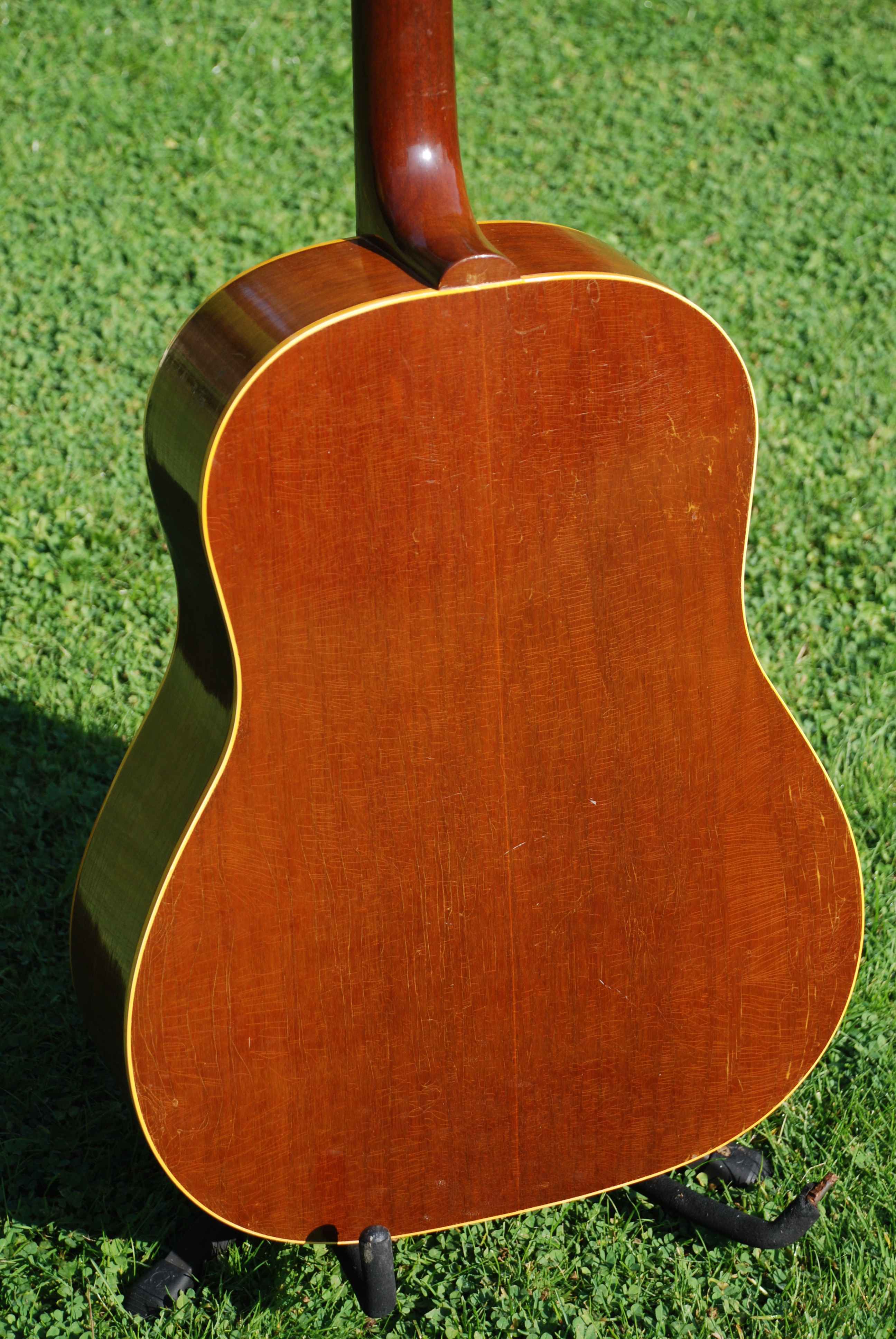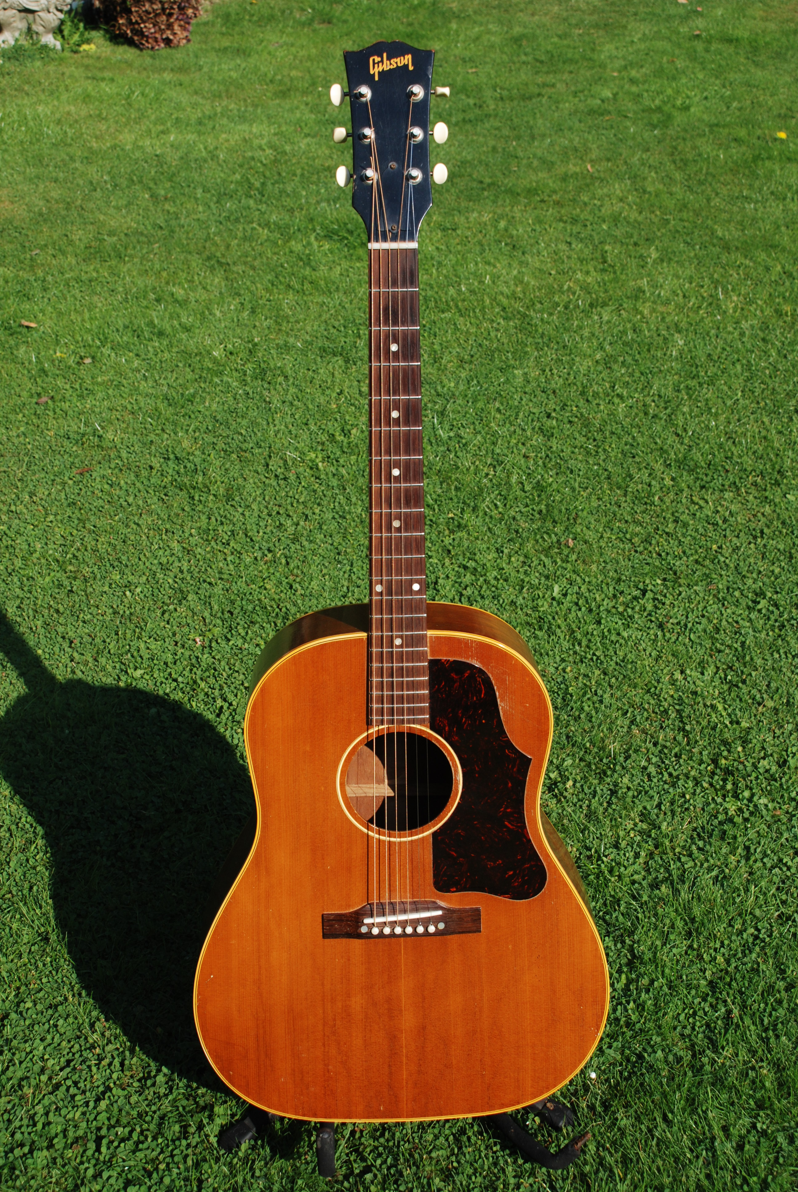 A truly lovely and very tidy example of Gibson's workhorse J-50 that is an absolute dream to play. Sometimes you get a guitar that is just sublime and this is one. I've always loved this model for it's clean lines and crisp, clear voice. This example is superb from every perspective and has probably the best pickguard that I've seen on a Gibson. All original and recently neck set, it is ready for the road. Soncially, it's every bit a J-50. These guitars have a very immediate attack, no wilting violet here......with great clarity in the note separation and a lively, powerful sound with lots of harmonics and a woody sustain. Classic in every way. 2nd time thru this gallery. Many luminaries in the acoustic guitar world used the J-50, among them James Taylor, Bob Dylan, Neil Young, Phil Oakes, etc.