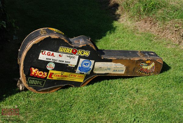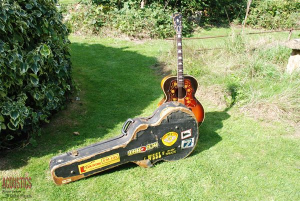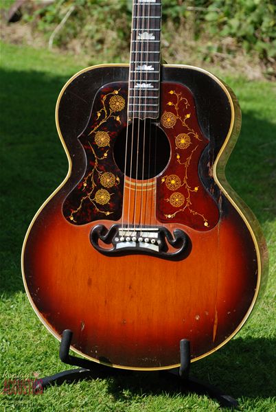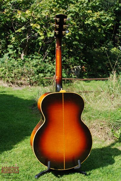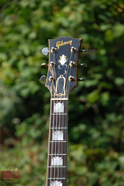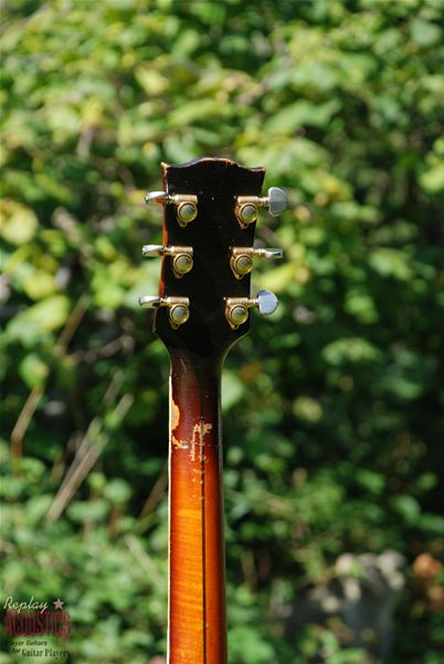 Talk about mojo.......where has this old girl been?? What an amazing survivor of the road....a '59 burst 200 in beautiful figured maple with a sunburst finish to make Utah jealous !! Played and played and played by Don it turns out and it's still here and ready to have another 10 rounds. All original guitar with an original factory added extra guard that is nothing but country, country, country. Maple rims and back with a sitka spruce top, hand carved open work rosewood mustache bridge with drop in saddle, original gilt Grover pat. pendings, a tapered headstock (thought those were gone by now) and a sound that would make Townes Van Zant give up the bottle. We've just had an old rim crack re-done and a few braces secured. It's one that I'm thinking might have to stay at home !!!