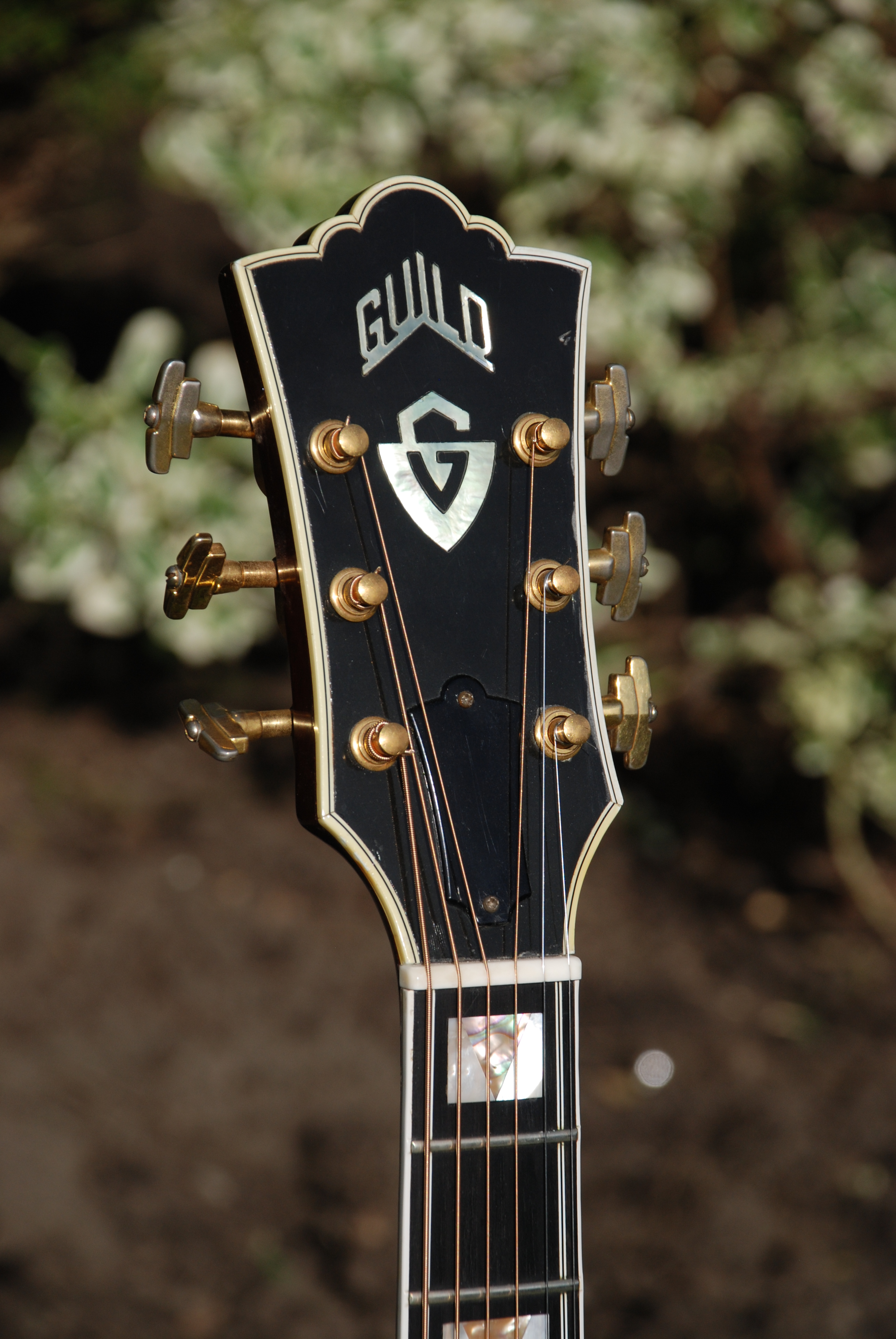 What a rare and wonderful instrument this is. An extremely early jumbo from Guild built at the Westerly factory in its early years. This is the model that was used by Dave van Ronk almost exclusively. I search and search for these and they never turn up, but here one is. In excellent condition being all original excluding the Imperial Grover tuners, which were used by Guild but not on this model. Crack free, it is every bit as good as a Gibson jumbo from all perspectives.......maybe better in the sound department. Indian rosewood rims and back with a sitka spruce top and all the design elements used by Guild at this time. It's big, fat and powerful and lovely harmonics and lots of sustain. Just another perfect instrument from Guild in it's Golden Era.