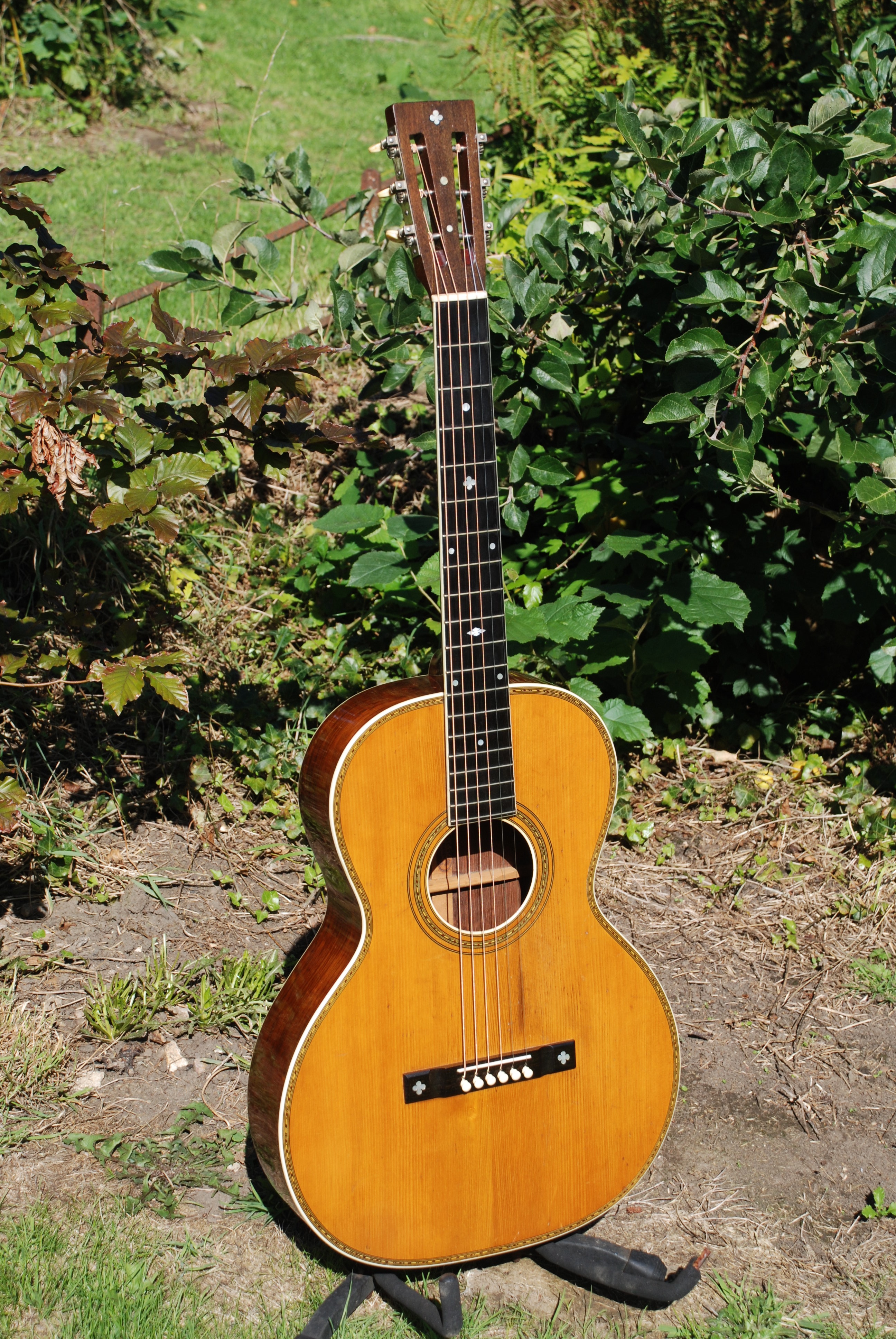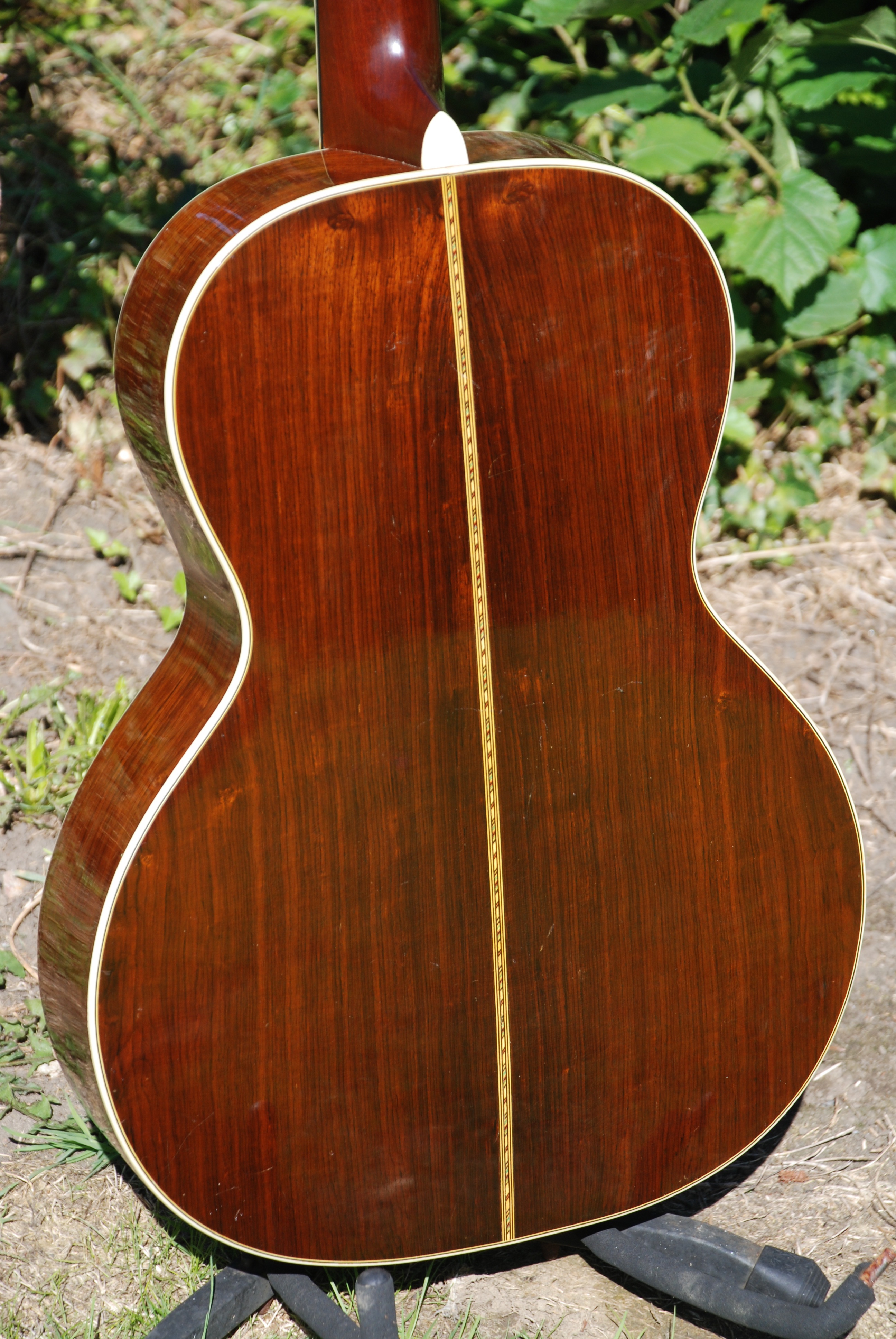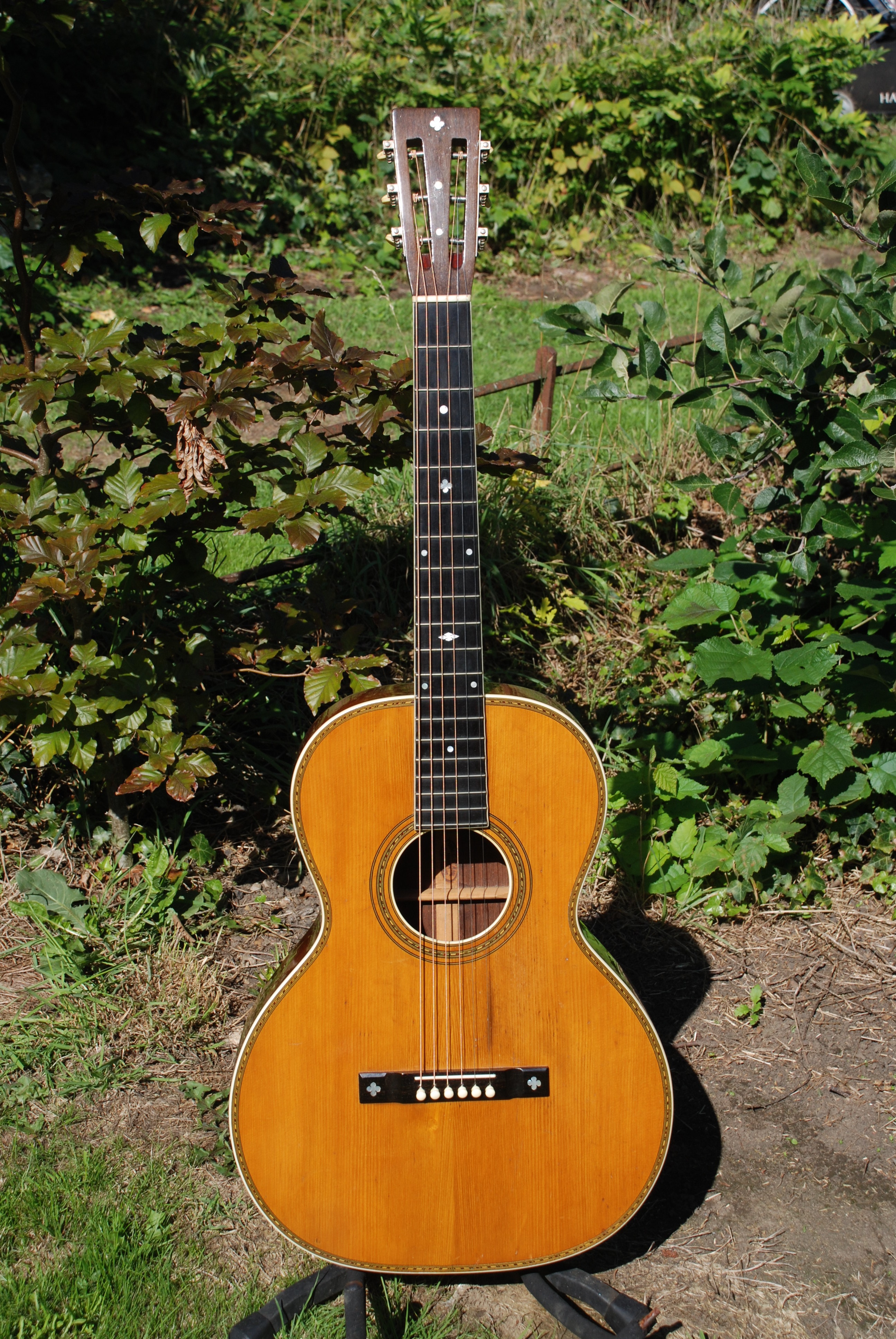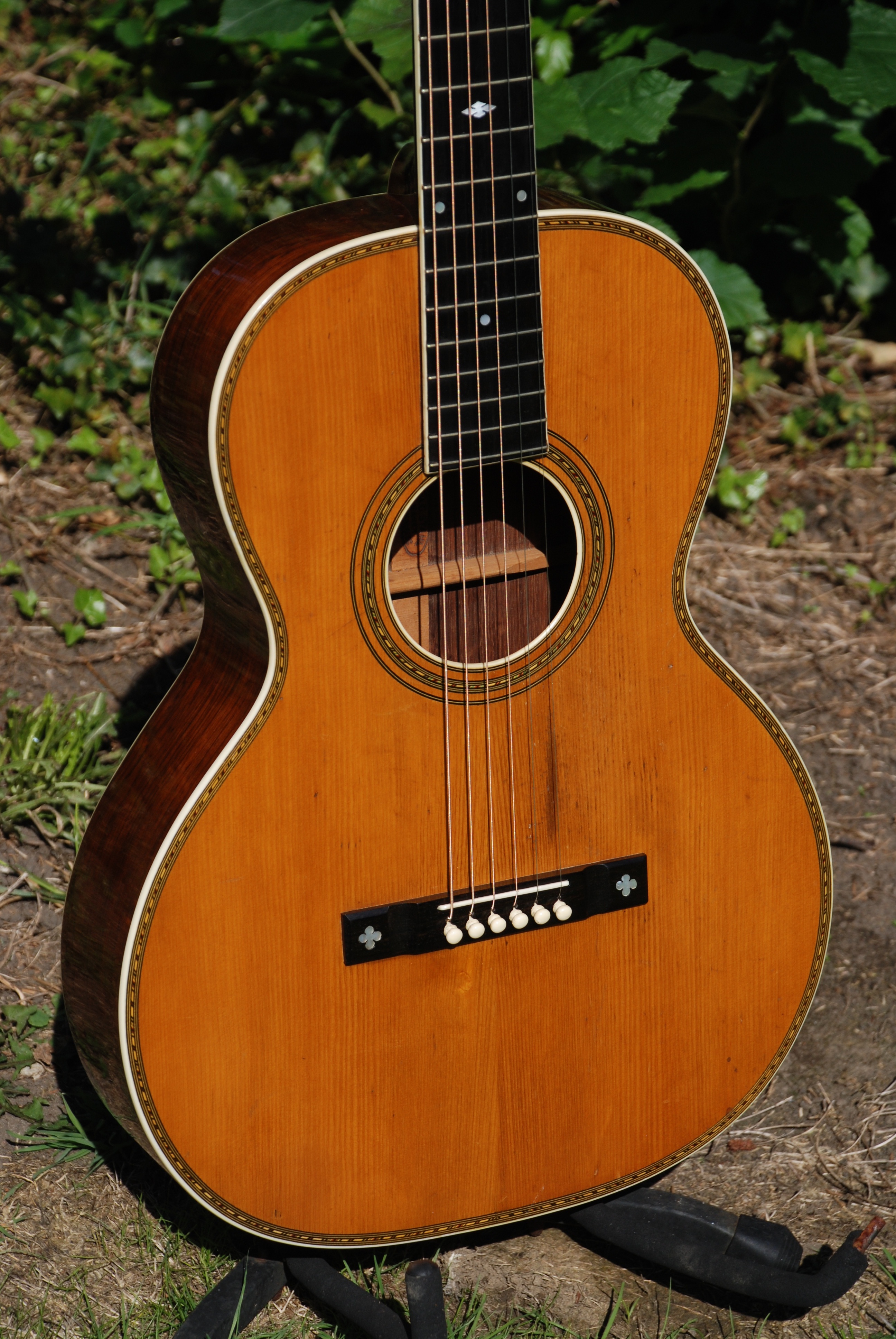 If there is any group of instruments that, in my humble opinion, are underrated and undervalued, it's this group right here. The Larson Bros. And if there is a guitar that can honestly compete with the best that Martin has to offer in the early, fingerpicking style than it's the Larson guitars. I've owned this before and gladly, it's back. I had forgotten just how sublime this instrument is. All original with laminated X bracing having a rosewood core and the thinnest body that I've known. Beautiful brazilian rosewood back and sides of the color we find in the 30's and early 40's Martin instruments with that beautiful brick red patination. Adirondack spruce top with checkered bindings and soundhole surround, ebgony bridge with cross pearl inlays and decorative inlays in the ebony board and headstock. Slot head, obviously. Sound? Come play it !!!!
