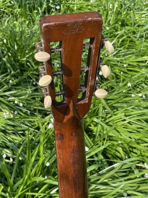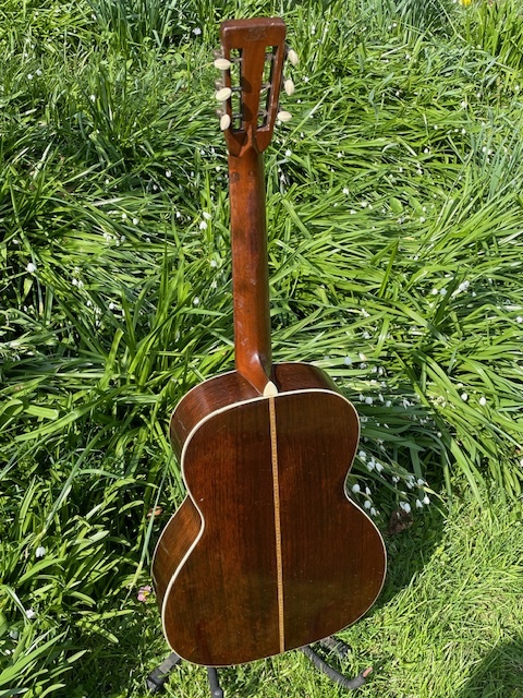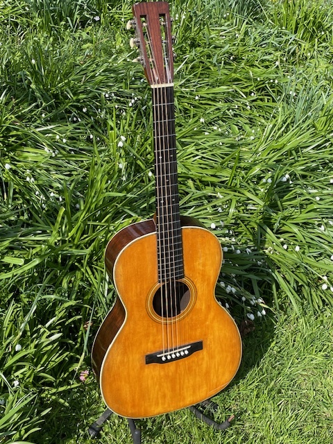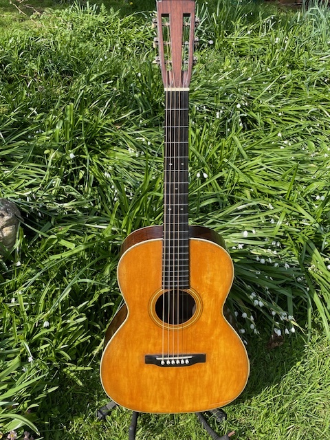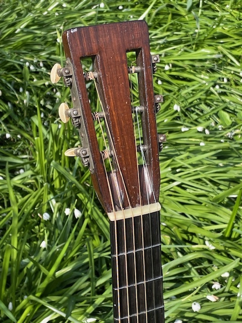 This guitar is in excellent condition being unmolested inside and out. When it came to us, the fingerboard had been shaved down over too many years of too few luthiers to do neck sets, to where it was too thin to properly hold bar frets or support the string tension. Keep in mind that these early Martins have much thinner boards than they do as time progresses. So Dave took the original board off intact and then applied a shim under it with an ancient piece of ebony to bring it back to correct thickness and then re-applied the shimmed, original fingerboard to the neck. You can't tell it's been done other than the off center fret markers on the edge of the board that we left in their original positions to document the restoration. A great re-fret with nickel bar frets and a set up and she was back in fine fettle to do the work that surely will come to it. Overall, the guitar is clean and beautiful and has a sound that is again, difficult to describe. I love 12 fret instruments and this is no exception.......being exceptional from every perspective sonically. When you get woods this old that have been assembled together since 1929, the various parts become one and the musical image this guitar creates is otherwordly. I don't know how to better describe it.....but I do prefer it to any other Martin's that i've had.....and it's in what appears to be its original case. There is a slight witness where an old, non-original pickguard was applied and then removed.