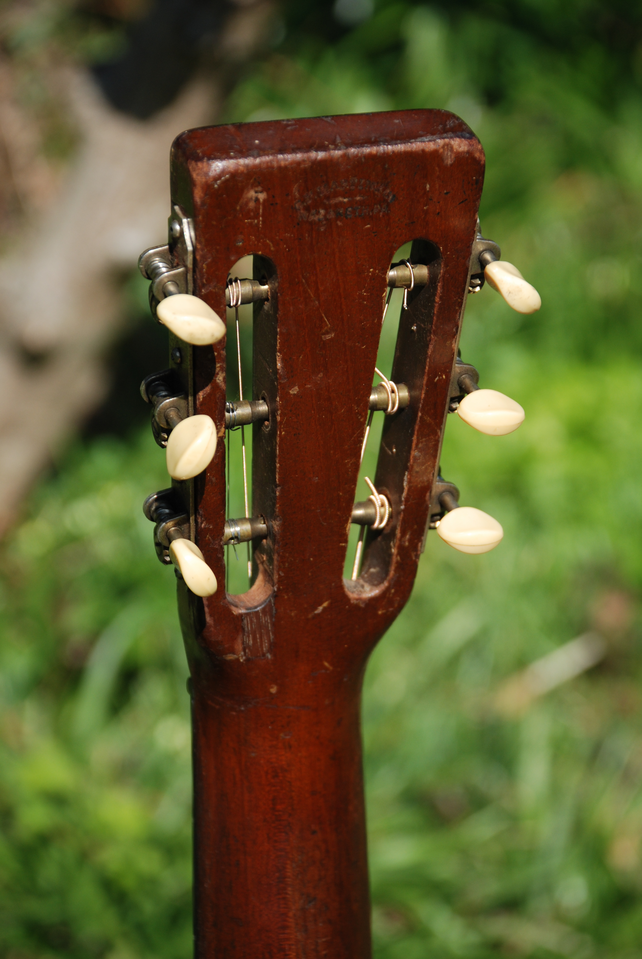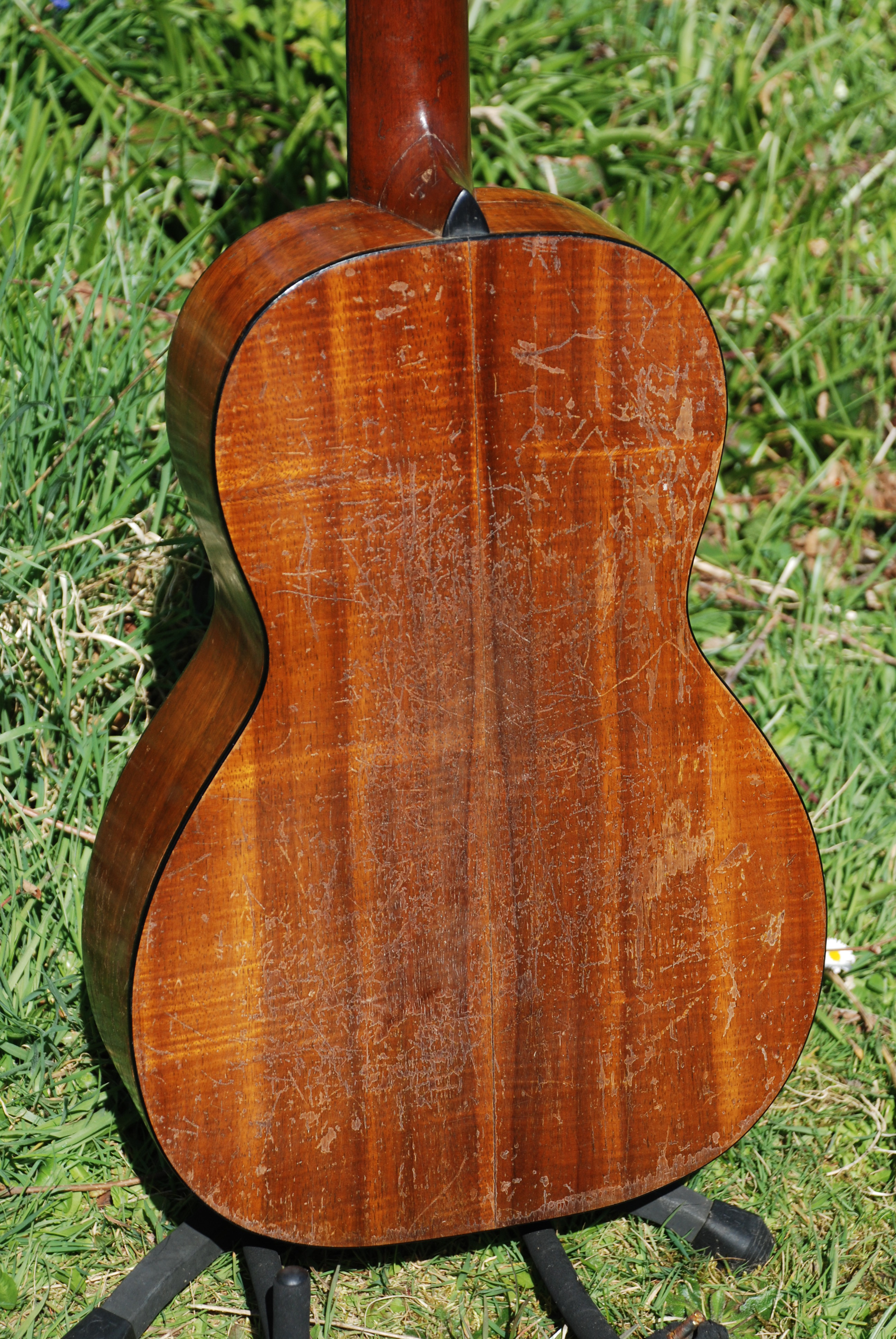 Whoo-eeee ! What a machine this is. The finest koa on the planet in a guitar that has been played more than "Dixie" !! It's amazingly all original excluding the tuner mechanisms, which are old and probably period make-do's, but they work fine and fit the character of this doozie. Ebony board and bridge with an all koa body, scalloped bracing lighter than the wind and playwear that speaks volumes to what this guitar has done and where it's been. There is a repair to one side of the slot where the tuner strip is attached and is totally stable and there are various cracks and repairs, none due to misuse.......just use. And, it's not a conversion from hawaiian either. I don't think this baby has had a night off since '34 and she makes music like she hasn't. Crisp, clear and woody with a melody that is fat and warm and all koa. One of the most soulful guitars that I've had and very hard not to look at.