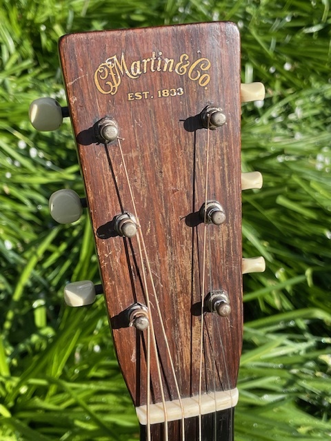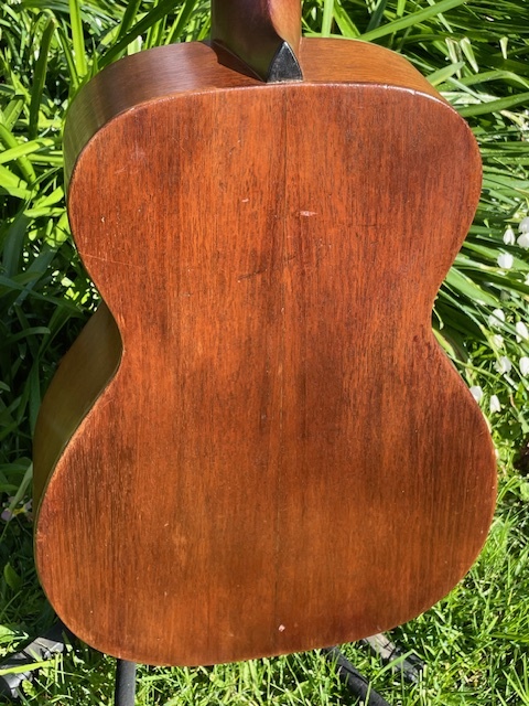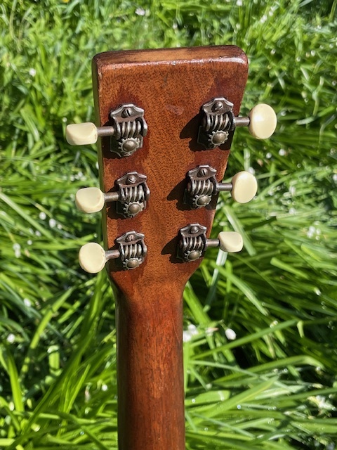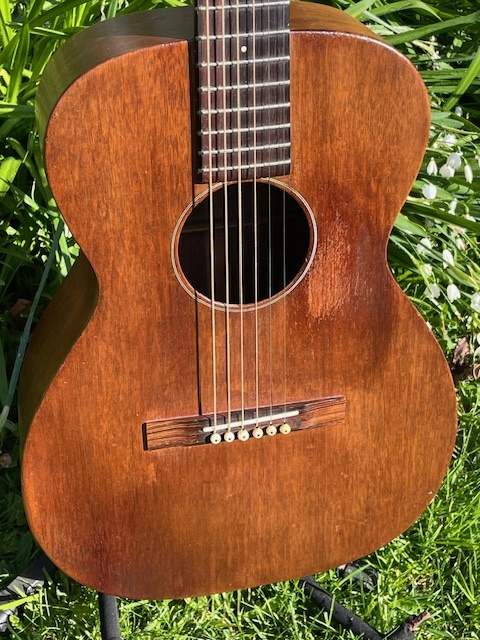 Rare things these pre-war series 17 instruments. 954 made in this year, all with mahogany bodies and top, mahogany neck and fully scallloped and forward shifted bracing. Voila !!! The magic combo. This old gal has been played more than most and has seen some stuff we'll never know about but it's all there excluding the missing pick guard, which I'm sure has been off longer than it was on. Warm, woody voice with a shorter sustain and lovely colors in the voice of this little box. A superb folk guitar to play the likes of the Bobster or Joan Baez.......