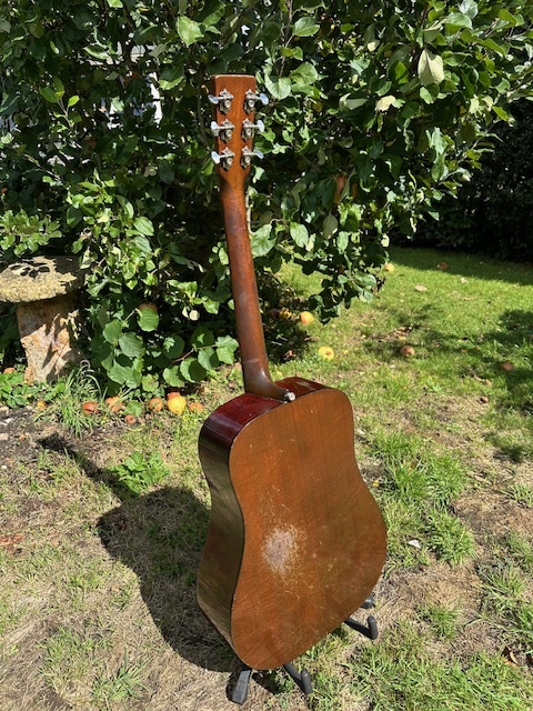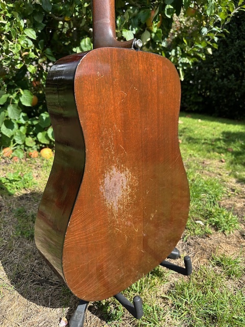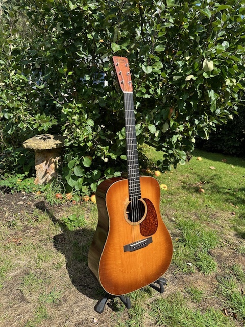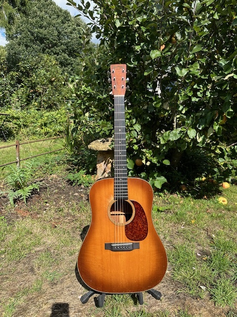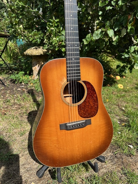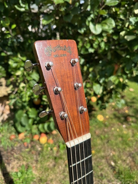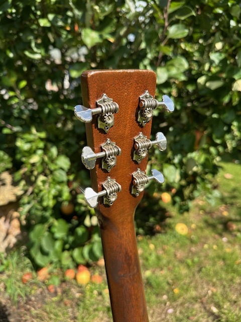So rare are these shade top D-18s that they compete with chicken lips for scarcity. An old gal that has seen the road for a good length of her time on this rock. Mahogany rims and back with a mahogany neck, Adirondack top and ebony board and bridge, the magic combination. Sonically, it's so complete. Still crisp and extremely responsive but with all the maturity and warmth on could ask for. Fully scalloped bracing forward shifted which was to end in 1939, which allows much more movement to the top and combined with the ebony board and bridge proves to be the Golden Era moment. The shade top in this tone is quite rare and has the appeal of butterscotch. The inside is unmolested and there is a patch to the upper treble bout, which resulted many years ago in the rims being oversprayed slightly off color to the back. A few other cracks but the top is crack free. Original tuners in the case with a set of origial spec mounted and a replaced guard and bridge.....all to be expected..... and otherwise, she's in fine fettle. Rare instruments do come and go.....this one probably won't come again.