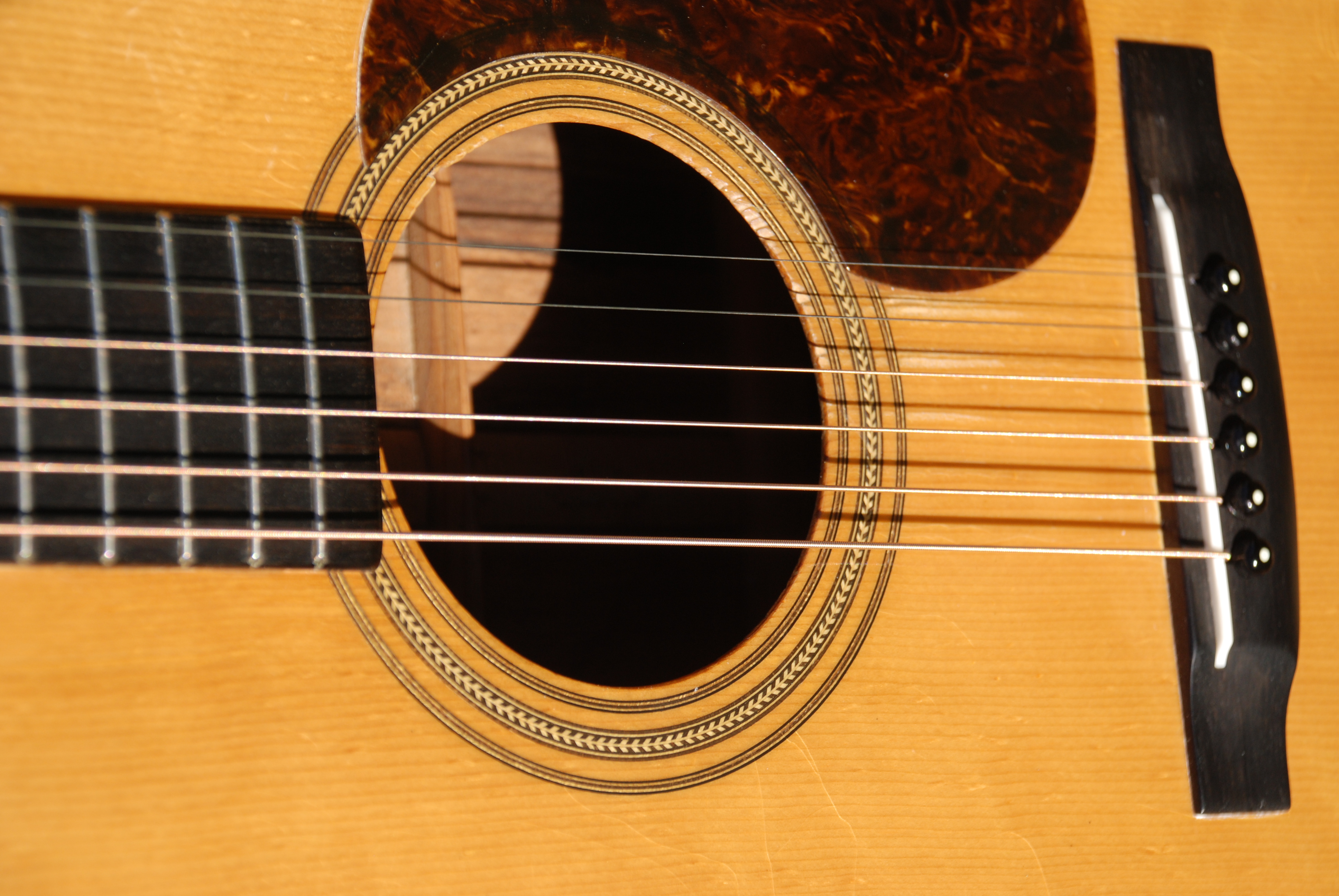 A rare war period herringbone 1943 000-21. Such a rare thing. This guitar is in quite good condition structurally and makes a beautiful and classic series 21 sound with rosewood all around including the board and bridge. Original tuners and pickguard as well. First listed with 14 frets in 1939, this is obviously the 5th year of production and 96 were made in this year with a total production of 401 during the war years for America. They spec differently than the pre and post war examples in that they have an ebony rod in the neck and lighter, much less expensive tuners, usually without grommets but this one has them. It also has had a steel adjustable truss rod installed in 1981 in Olkahoma, with a label inside the guitar attesting to this work.