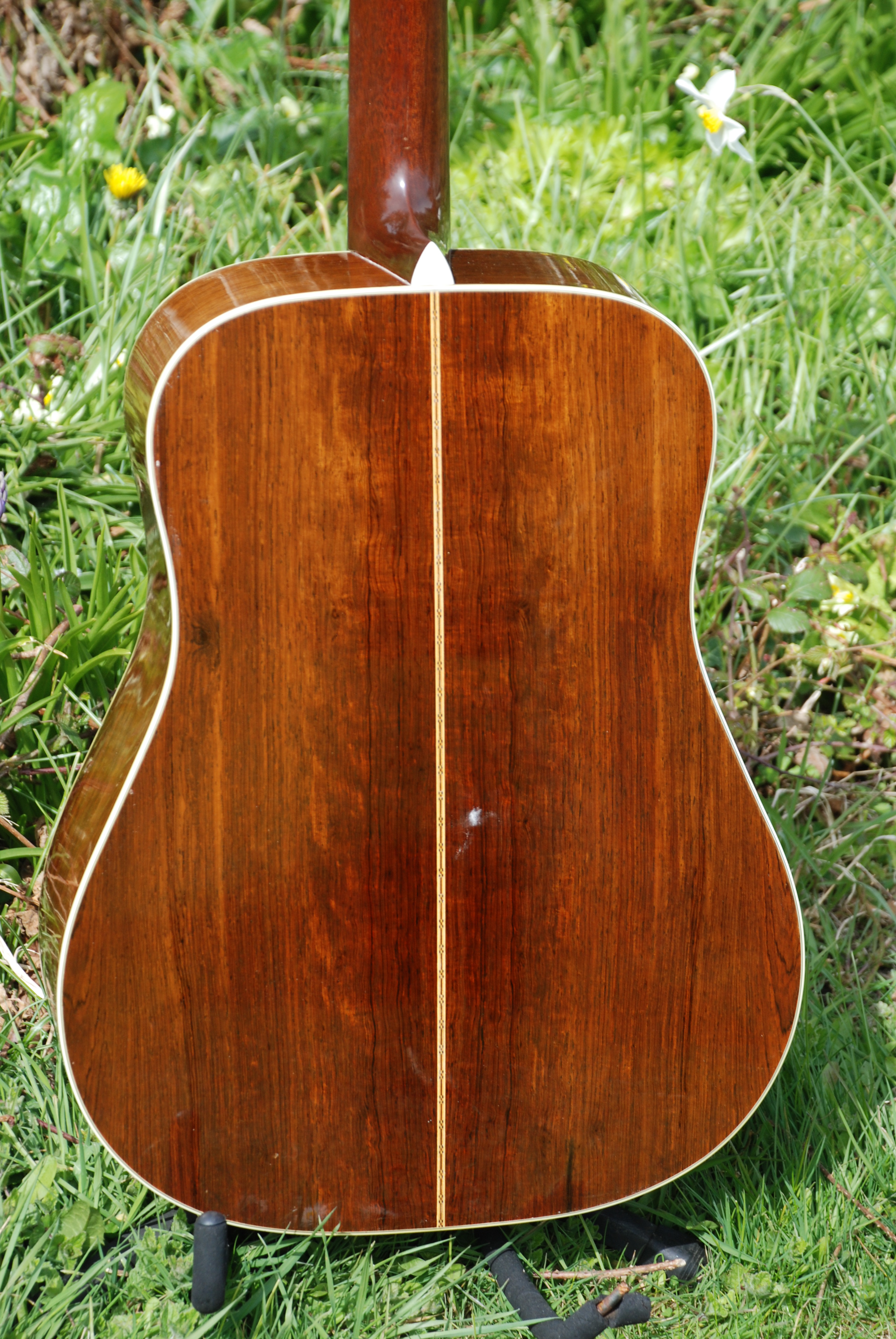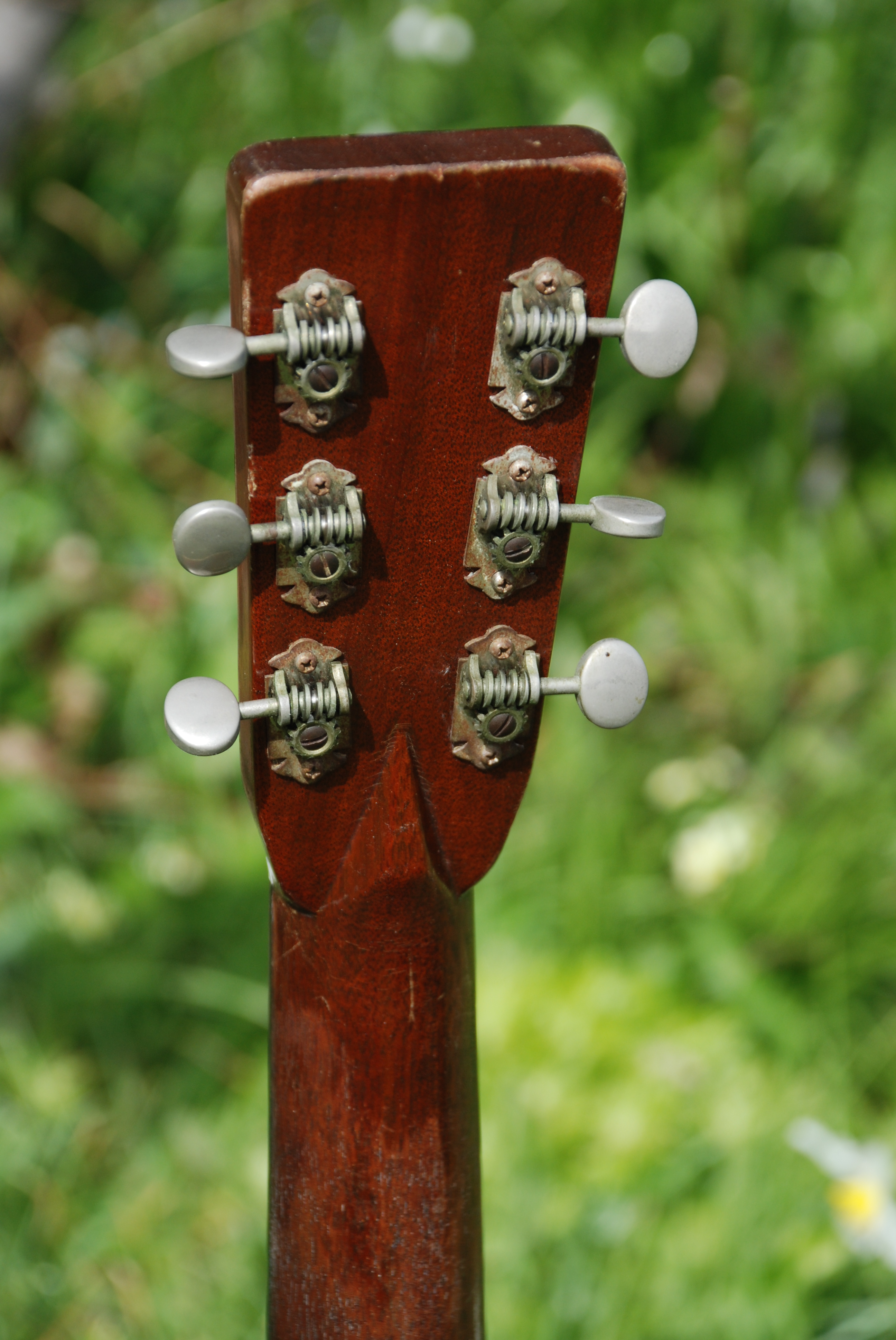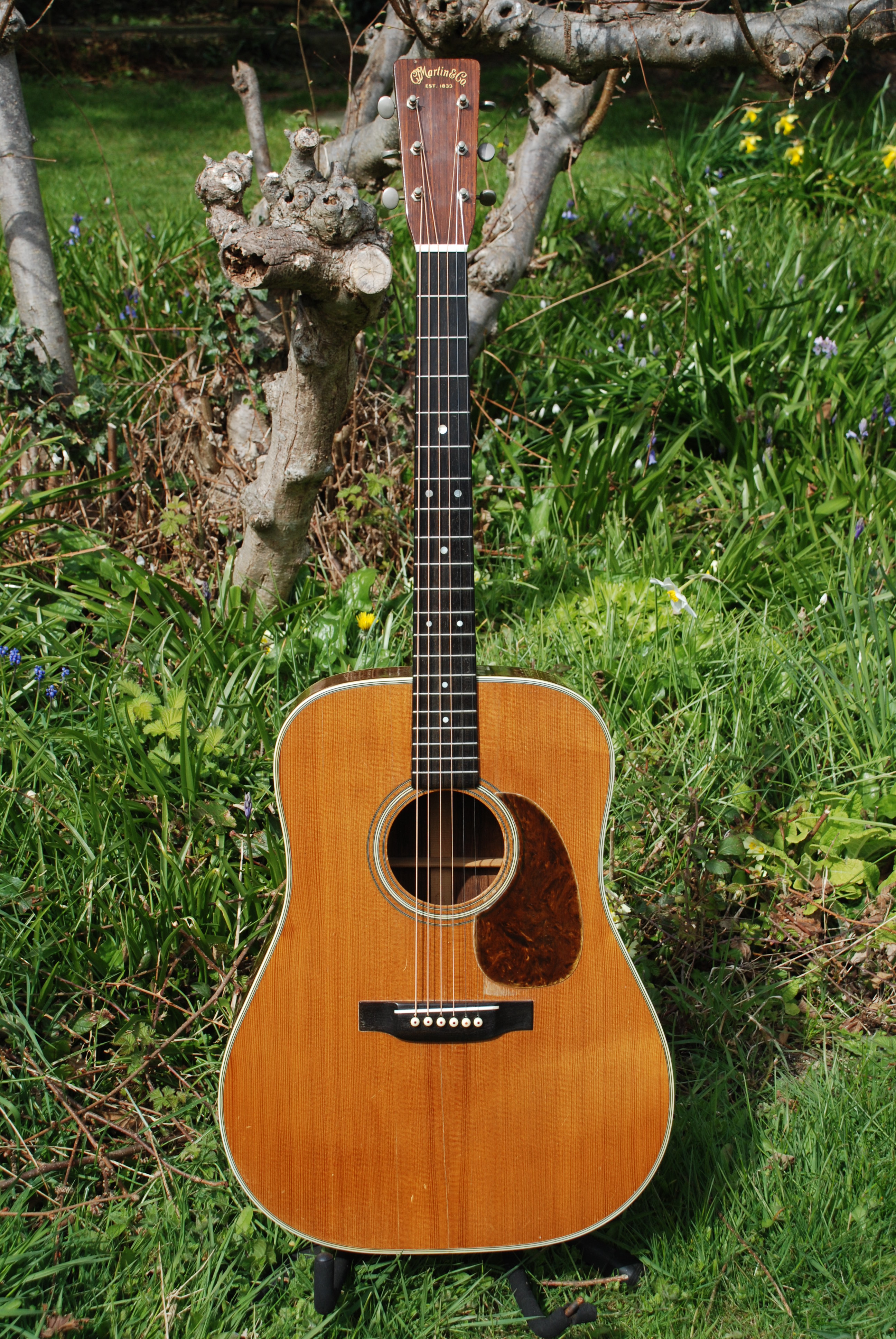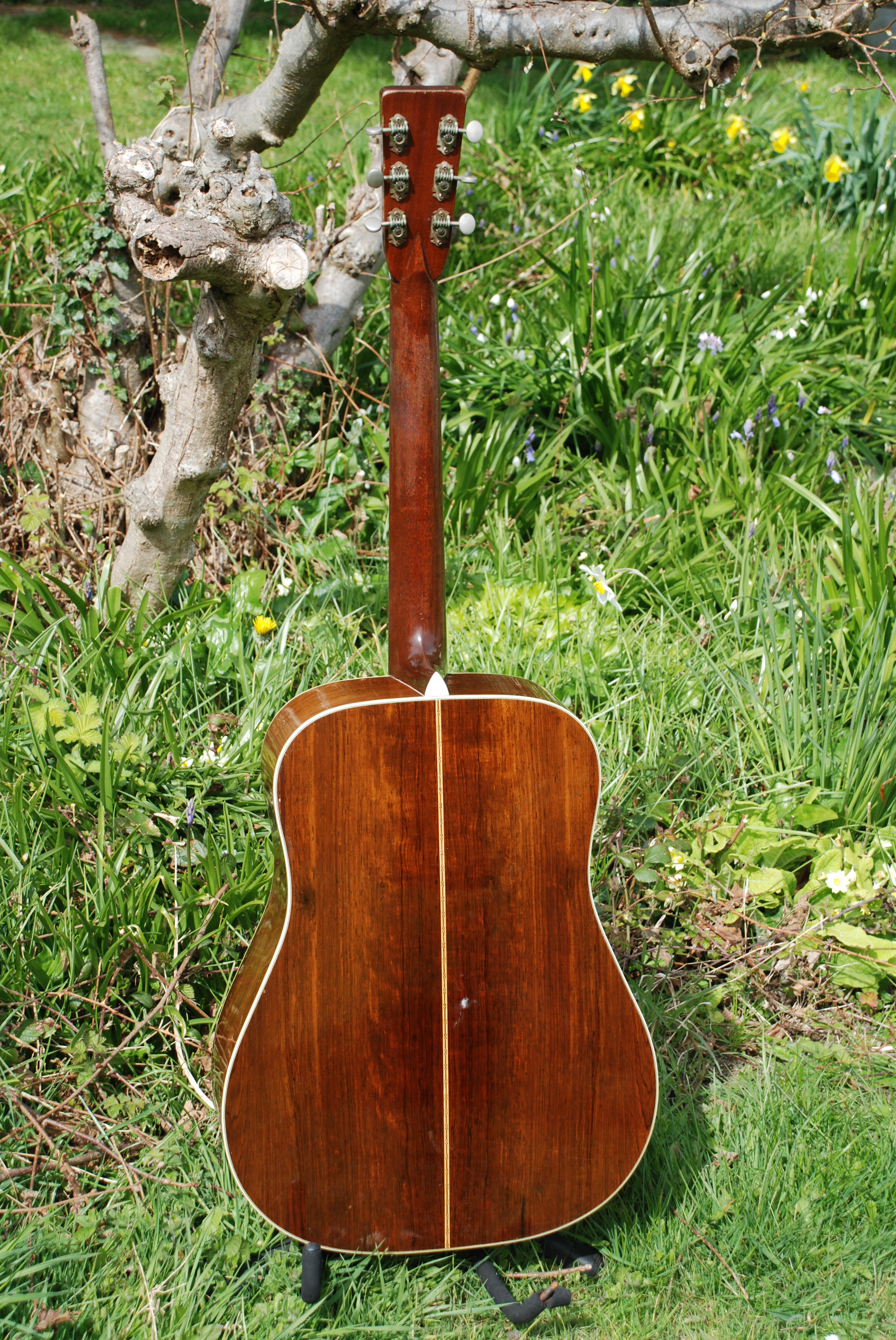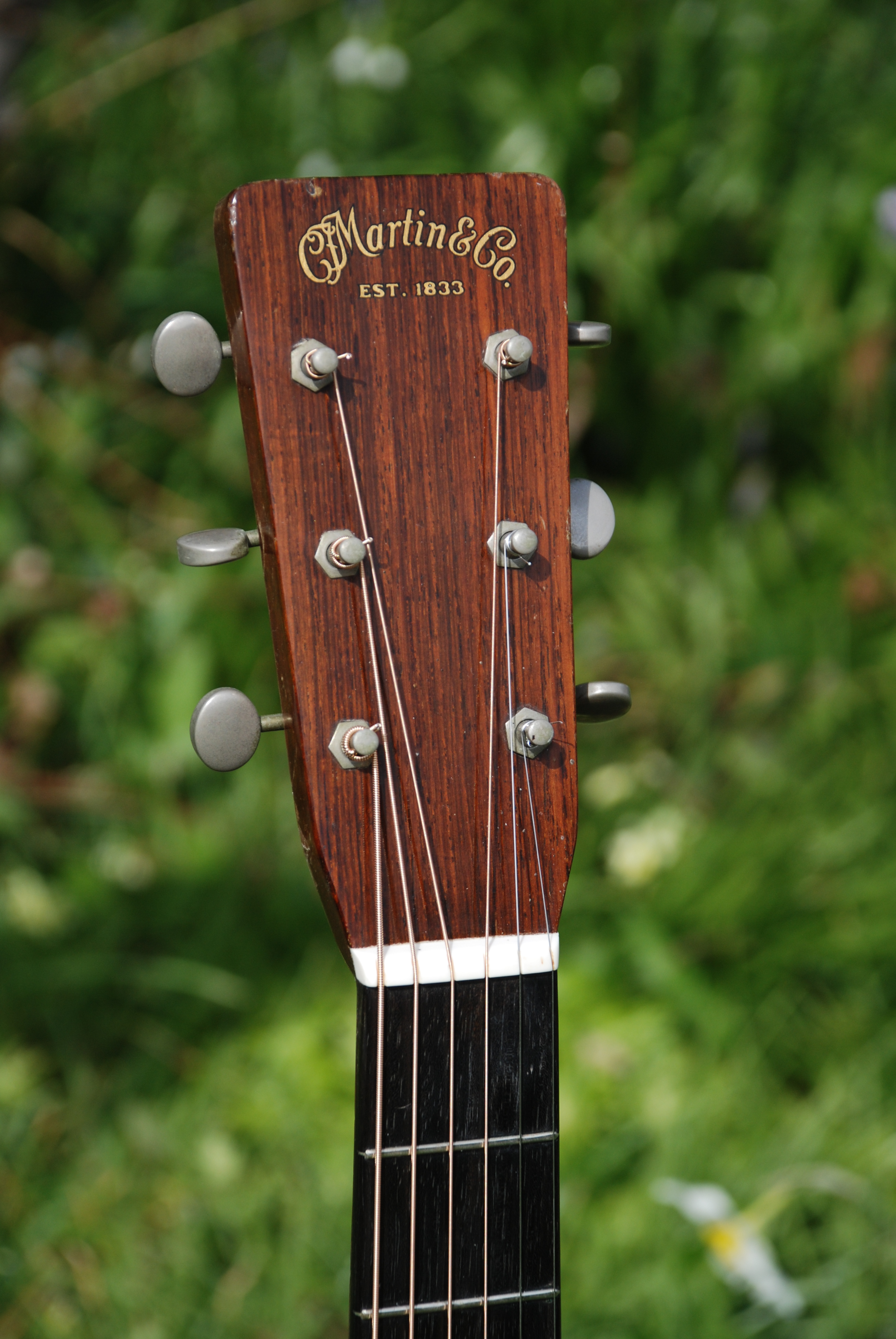In storage for 5 years and then in a private hand, this is one rare guitar. I've only owned one '47 before this and they seem to be very similiar in their tops, tonewoods, color and the quality of sound. This came to me with black strings on it and it did have a slight mustyness, but for only a moment. It is all original and has that great, war era brick red rosewood that ended just about this time......maybe into '48. Just. The pickguard is that lovely taupy brown and is undoubtedly original to this guitar. The top displays bags of silking with some wide grained areas as well. Adirondack possibly. The tuners are original open back Yoda examples which is spot on for this era. Tonally, this guitar is exceptional. It has long taper bracing, which I have always been fonder of than the scalloped bracing of the war era bones. You get just that much more control without losing any resonance or sustain which is truly great if you have ever played an out of control "bone". Some can get a bit out of hand. But this is smooth, supple, with bags of resonance and sustain that is as good as any of my bones from past years. The fingerboard is full thickness and so is the bridge and the set up is divine. A few secure cracks and some finish craqueleur is about all needs mentioning. What more can I say? It's just one of those...... a superb Golden Era Martin D-28. Brilliant and shockingly good.