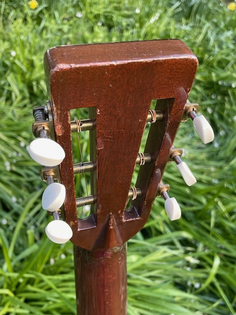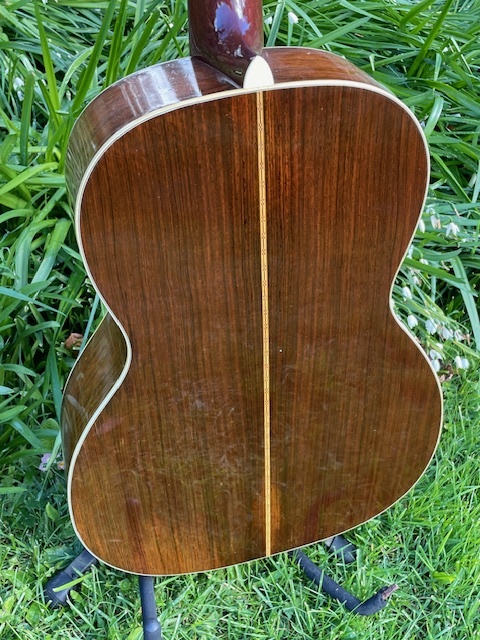 And it comes with a real story, not a romantic one. This guitar was found in an attic in Arkansas where for 40 years it was left strung up, which ruined the top.(which comes with the guitar) The old top has at least 12 long cracks in it. It was re-topped at Jet City in Washington State by the luthier Ed Claxton who did the work and managed to use the original herringbone bindings. It's noted in Martin's technical notes as being a "one off". Gosh, if they had only made 1000.
