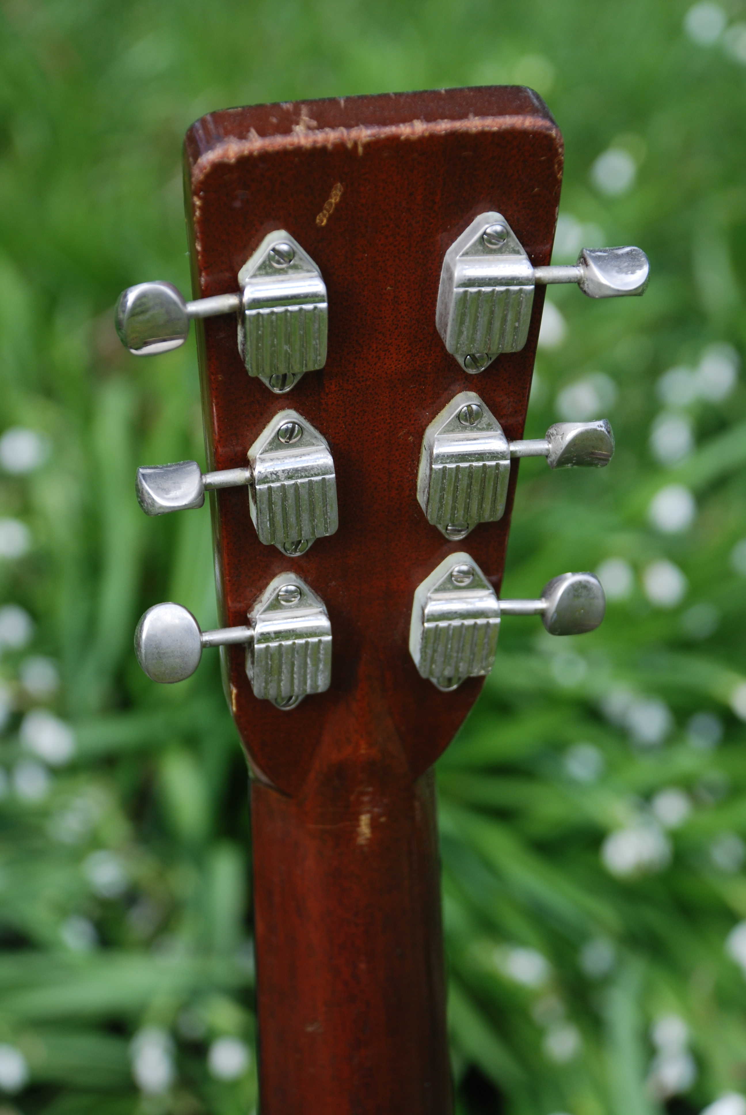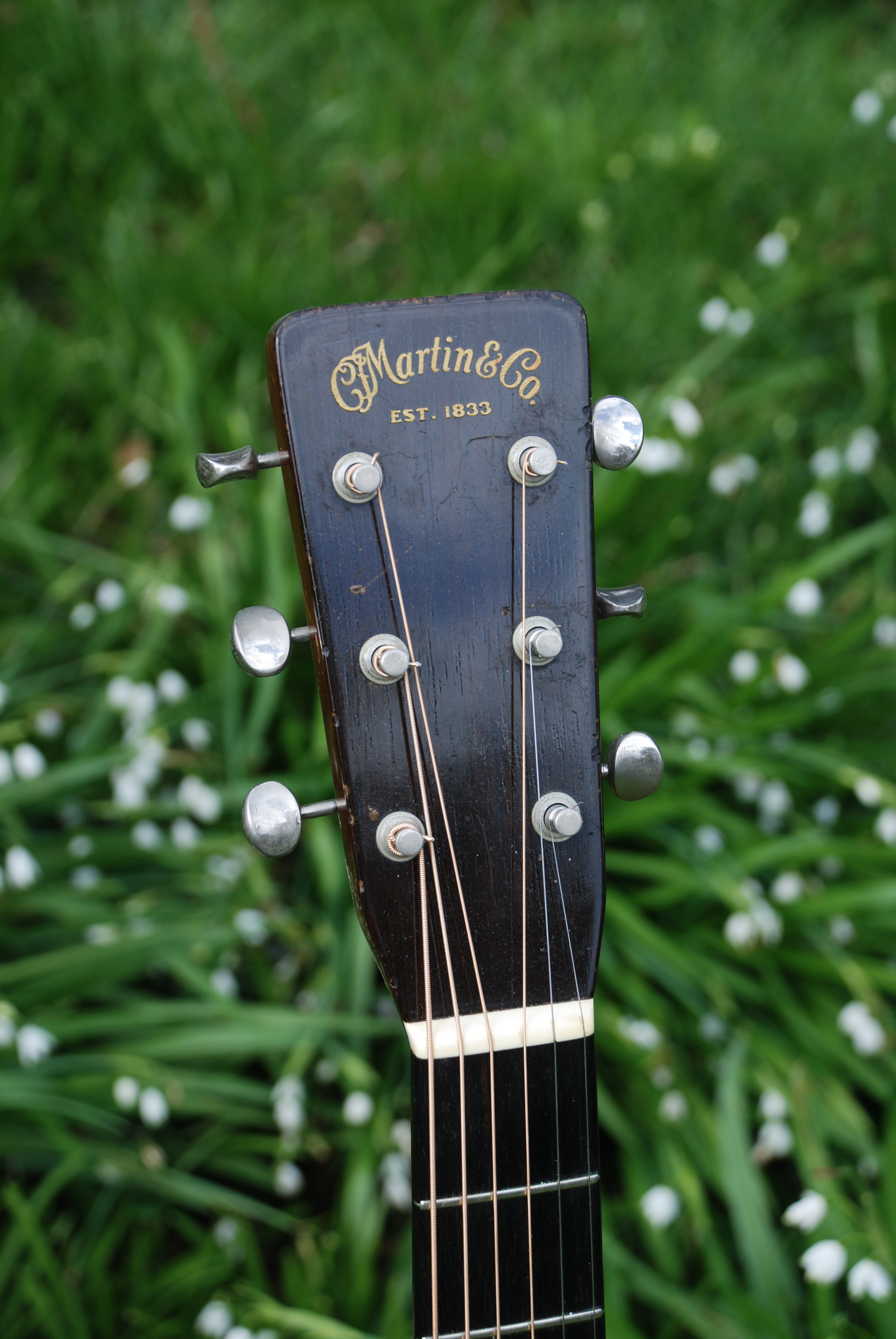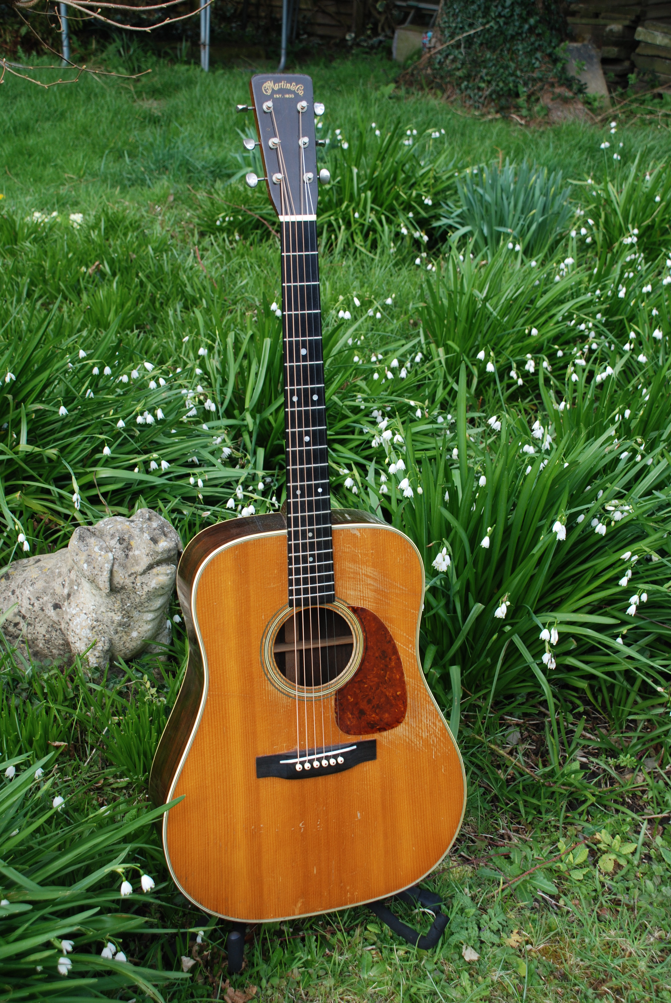 I've come to believe after all the Martin guitars that have come thru here, that the year 1957 had something special going on at the factory. Whether it was the batch of woods that were coming thru at that time or what, the guitars that I've owned from '57 have all had a very particular character and are all superb. This is another example of that thought. Lovely old D-28 with the butterscotch pickguard and in lovely condition. Brazilian rosewood rims and back with a sitka spruce top and mahogany neck. Lovely play wear and great color. The neck is really comfortable to use and the sound is, well..............classic 50's D-28. Legendary. If only we all could own one of these, there would be no more wars !!!!!!