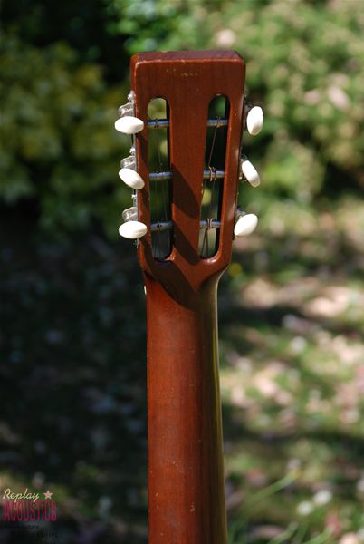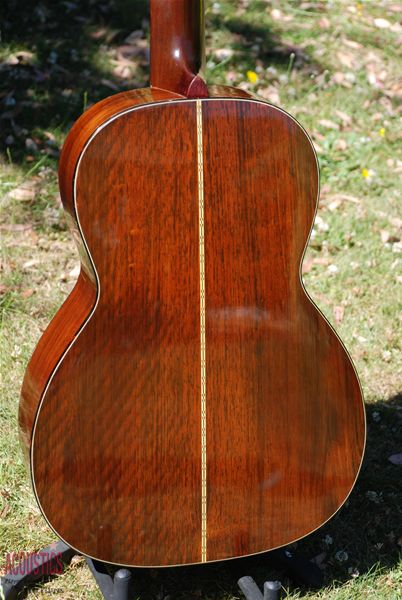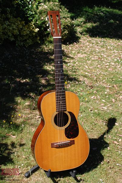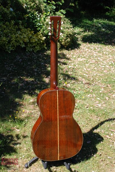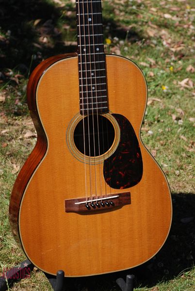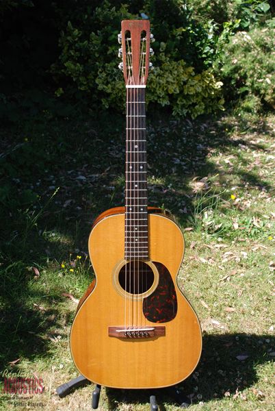 Such a rare model to find any more and this one is a real corker. I've owned it twice and it seems to get better each time. Lovely brazilian rosewood rims and back with a Sitka spruce top and mahogany neck, all original and very sweet patination. Lovely colour. From a sound perspective, it's very powerful and clear with great resonance and sustain. 12 fret action with a very comfortable neck radius......you just don't get better than these little machines for fingerpicking or flatpicking for that matter. Two very tight grain cracks below the bridge in dark streaks of the wood and a few short pickguard cracks......obvious why they are there and completely secure and tight. Otherwise, it's near mint.