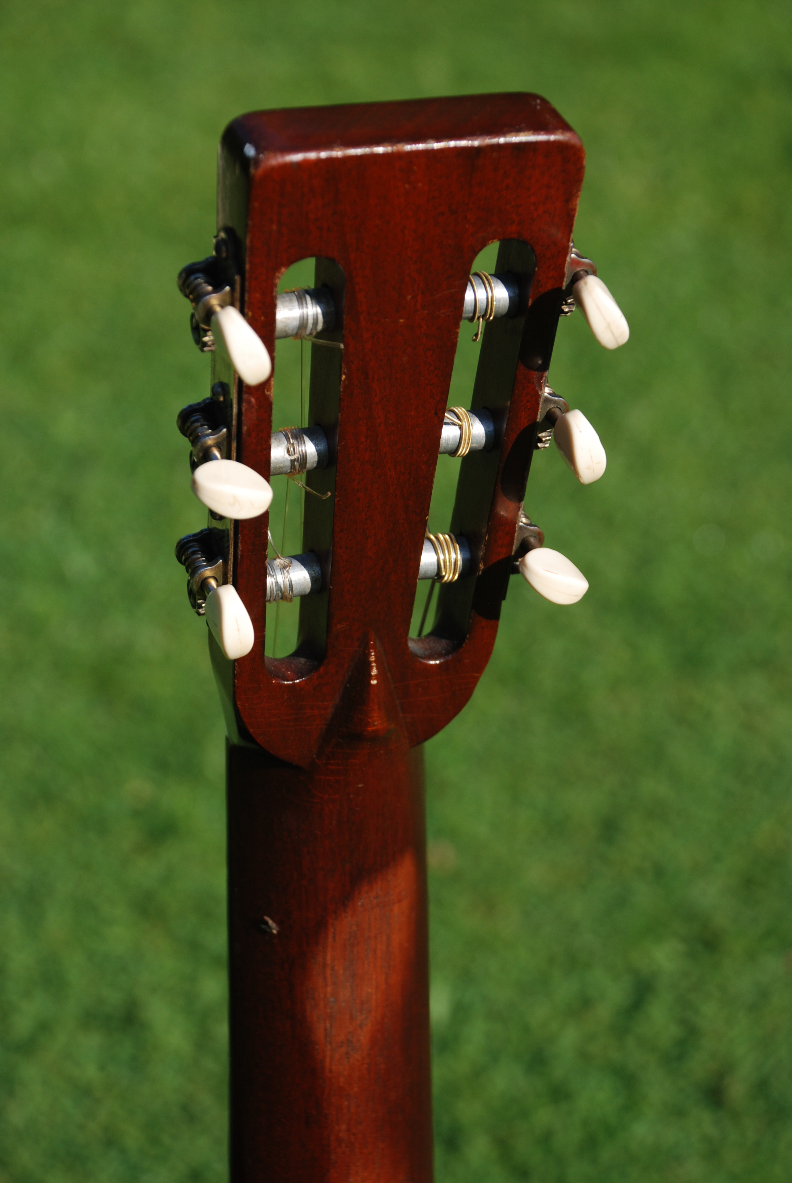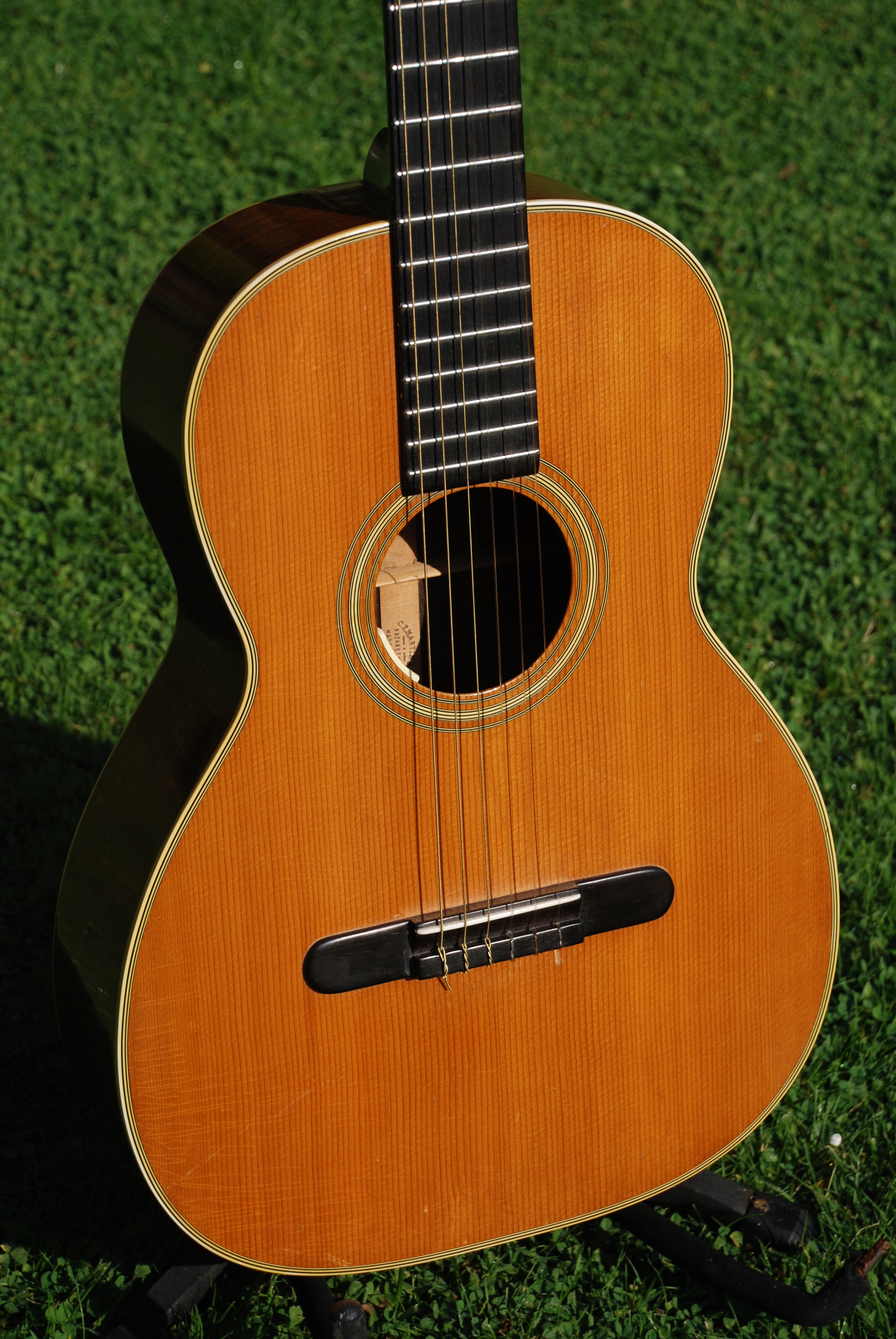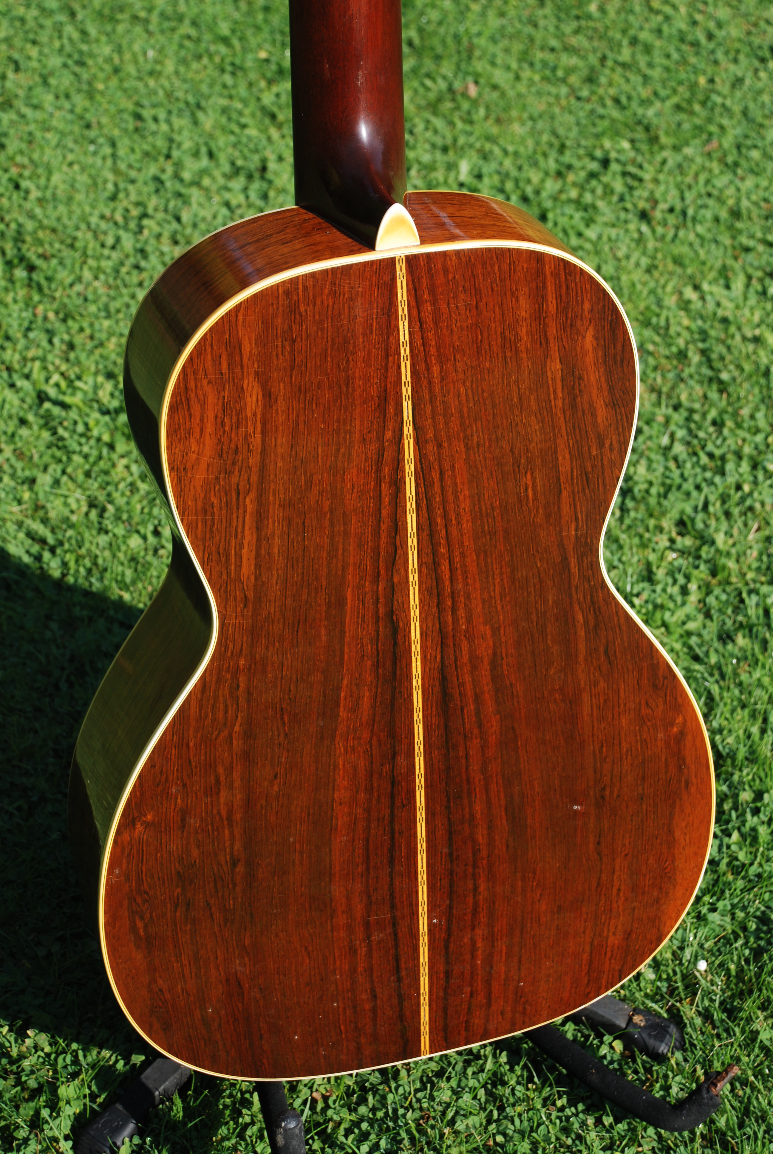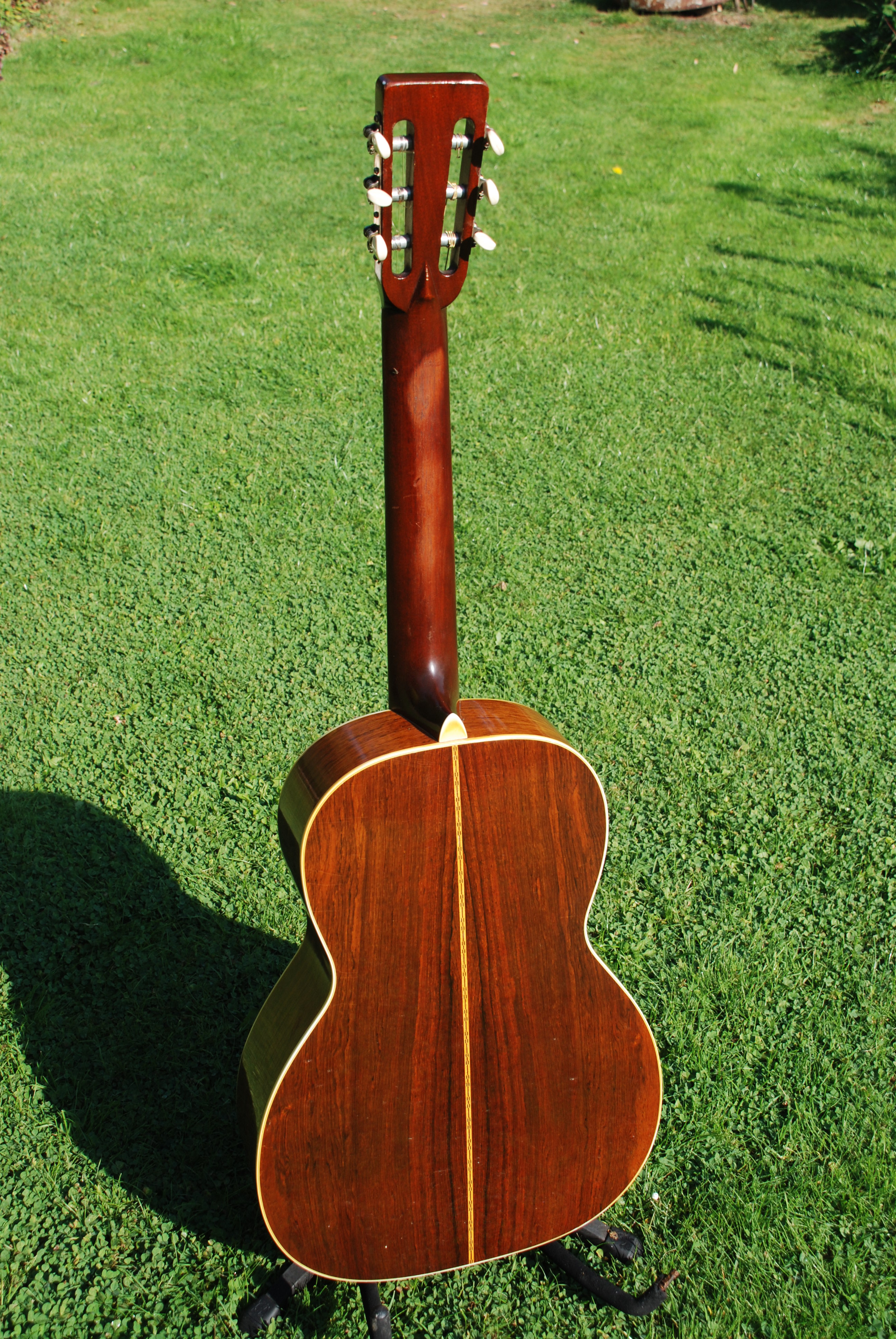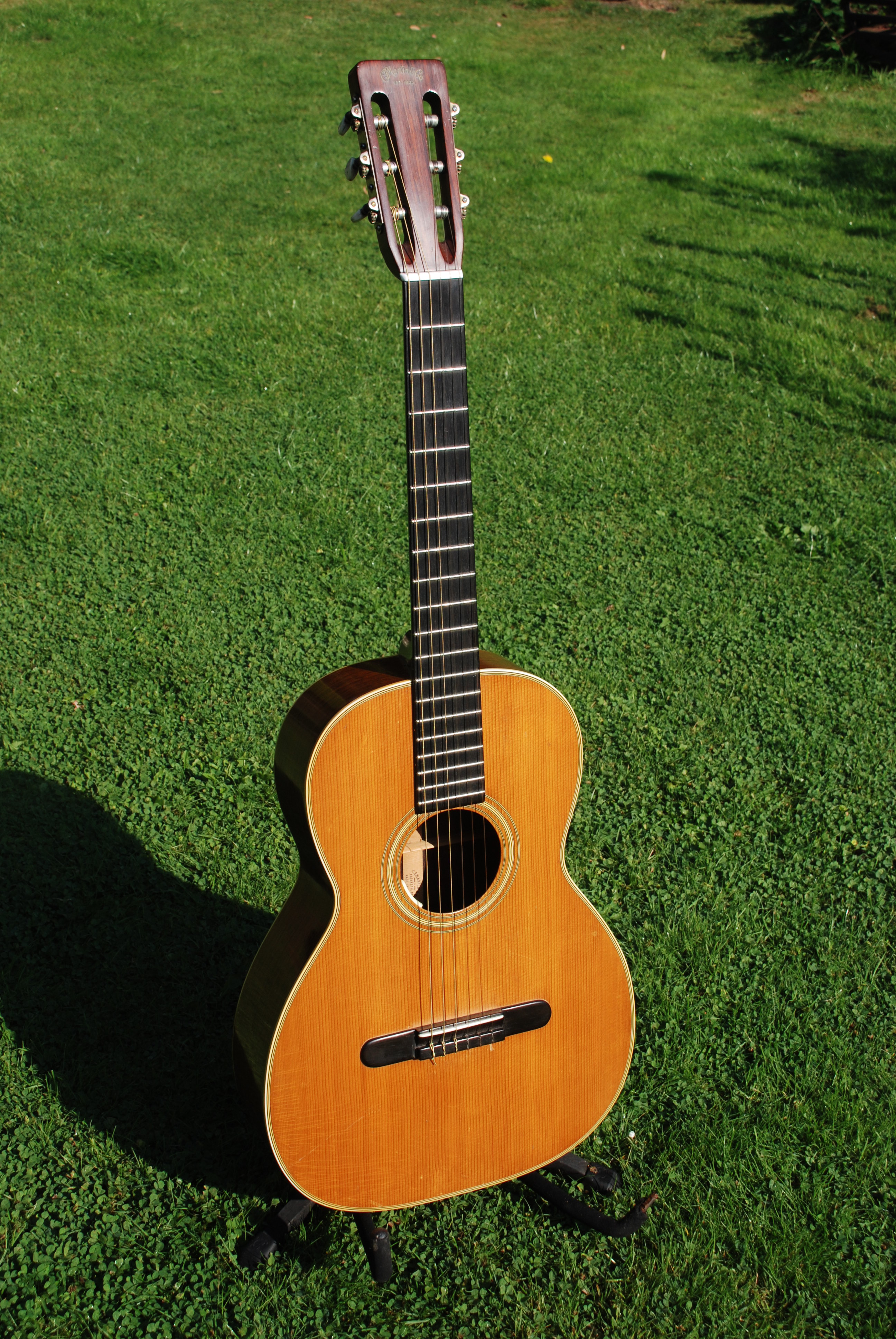 Every once in a while you get a guitar that has something special......it's always a combination of great tonal quality along with the ever important visual character that we all love. This little 00 Martin has that in spades. I don't even want to polish it. Brazilian rosewood rims and back of lovely color and grain, sitka spruce top, slot head arrangement and in excellent, all original condition. Fan braced with ever so lightly built structure, Martin made 301 of these in this year and only 1412 for the entire run of the model. Brazilian and nylon are a very special combination that almost all of the early folk combos and individual players used with great success. It offers a soft ( and that doesn't mean quiet !! ), melodic sound with great presence accompanied by a great sense of resonance and sustain. A wonderful relief to the steel string guitar and something every player should have in their stable for those moments.
