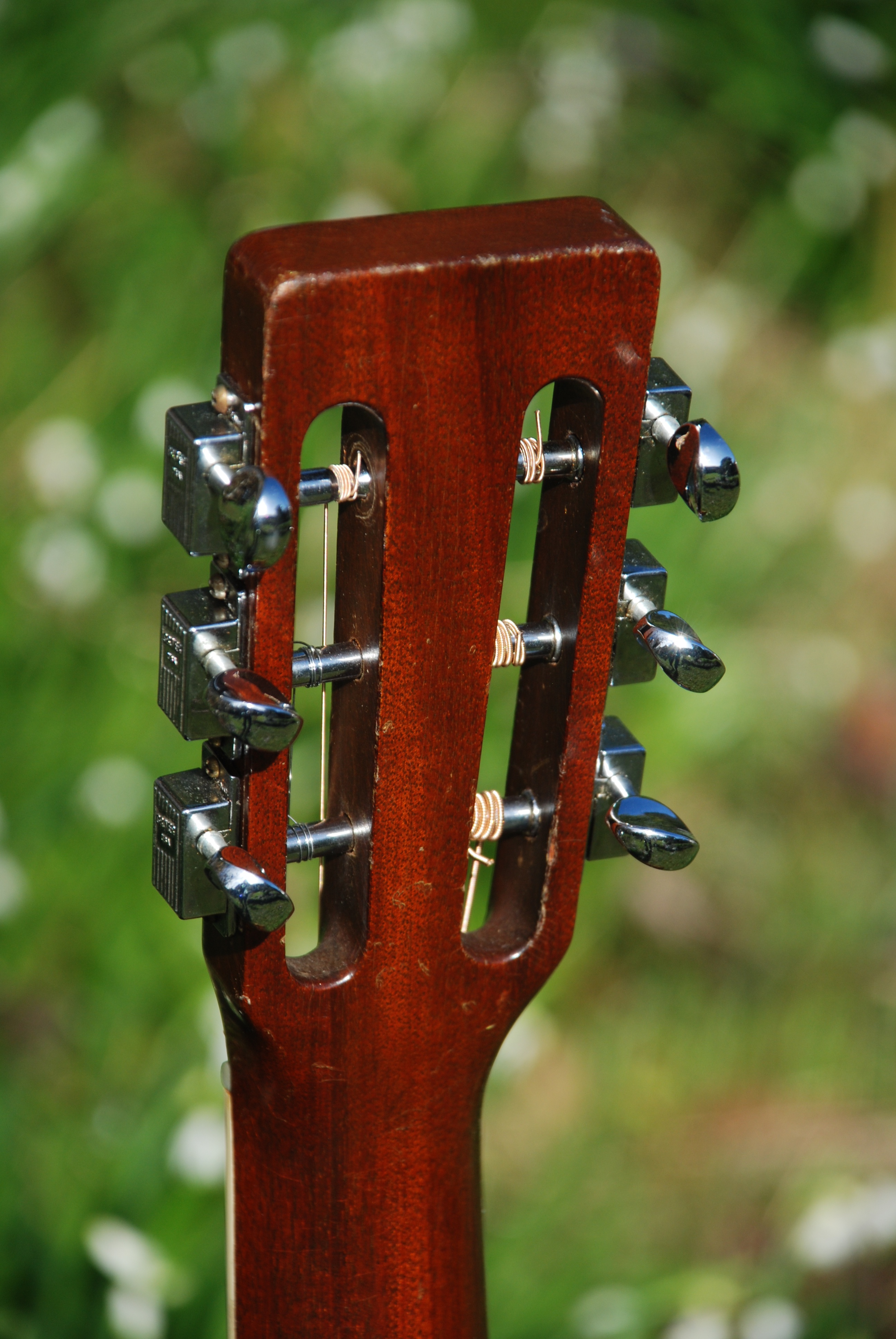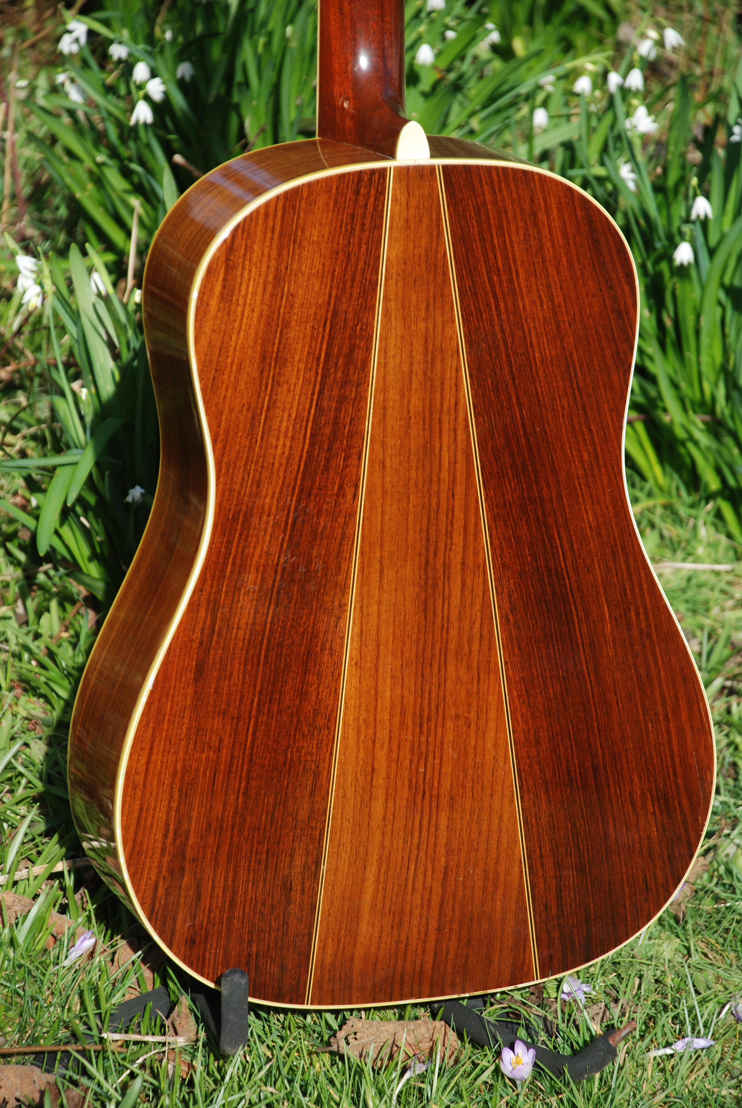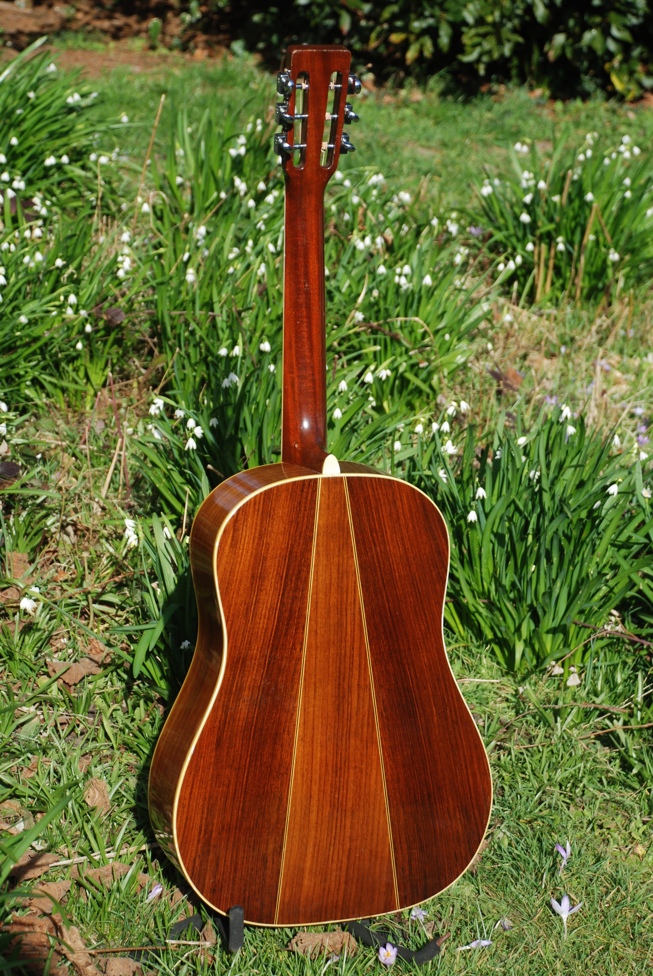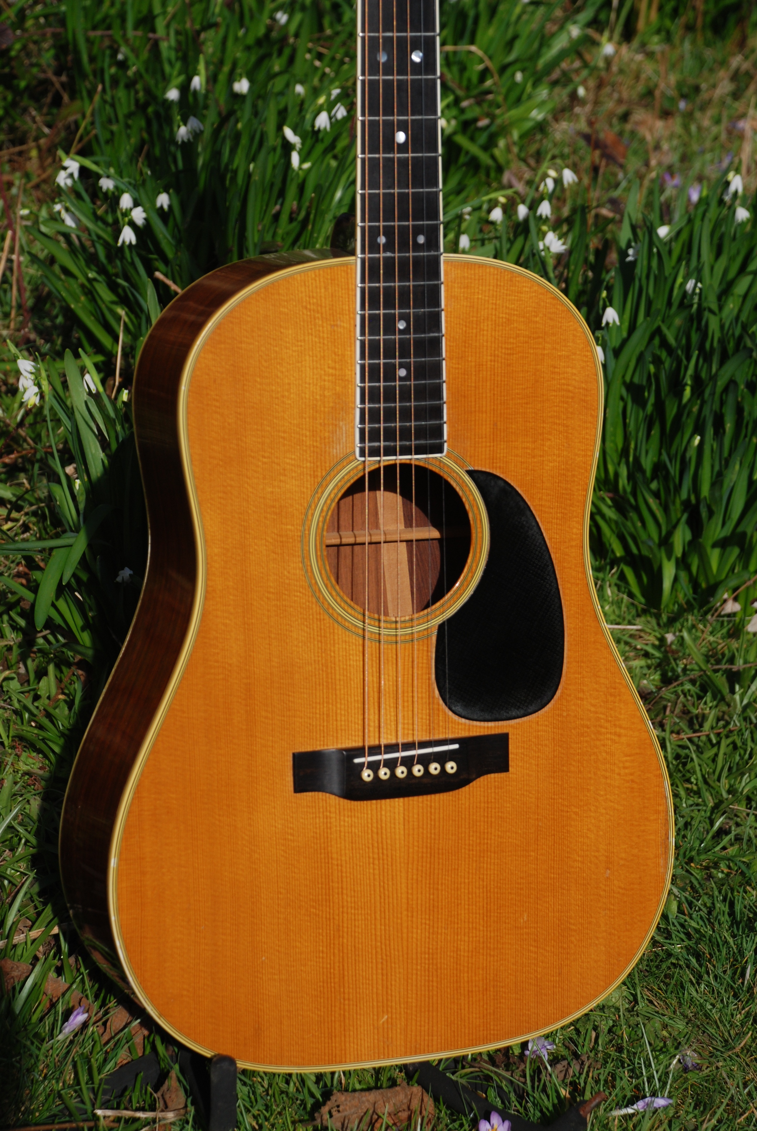 This is one of the models from the 70's that Martin made that I will happily include in my stock. The 12 fret dread. It's always a great sounding instrument and competes with the earlier brazilian examples in all ways. This example is a D-35 and has exceptionally grained Indian rosewood and a beautifully wide grained Sitka spruce top. Bound neck is standard on the 35 and from there on out, it's a stonking guitar. Very powerful and responsive with a fat voice and great harmonics. With the sound hole in what is referred to as the "sweet spot" in the soundboard, it can't help but make fine music. Lovely all original condition excluding the tuners, which are period and correct originals but replace a set of strip Klusons that someone put on it over time. No extra holes so nothing visually disturbing. Super guitar !!
