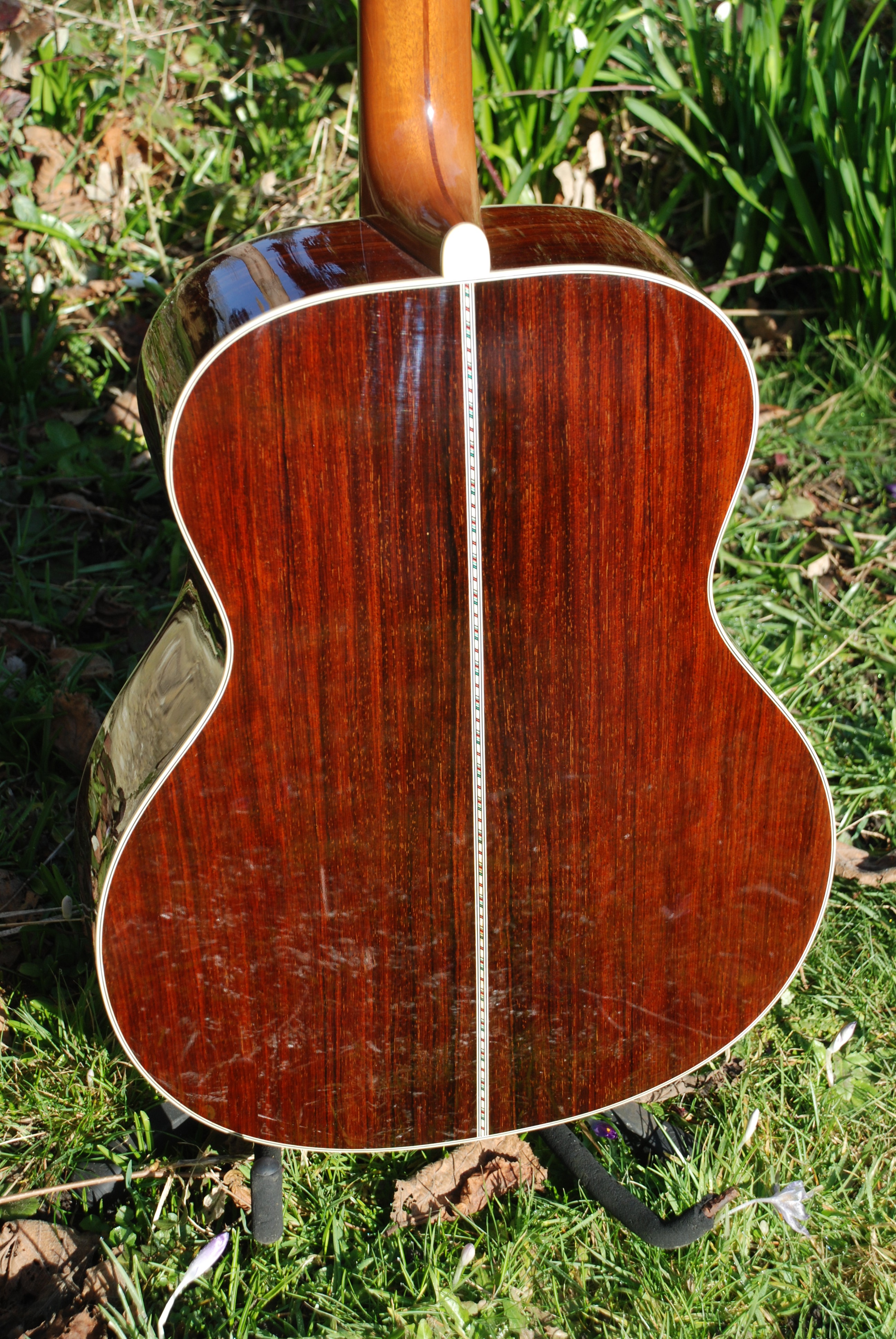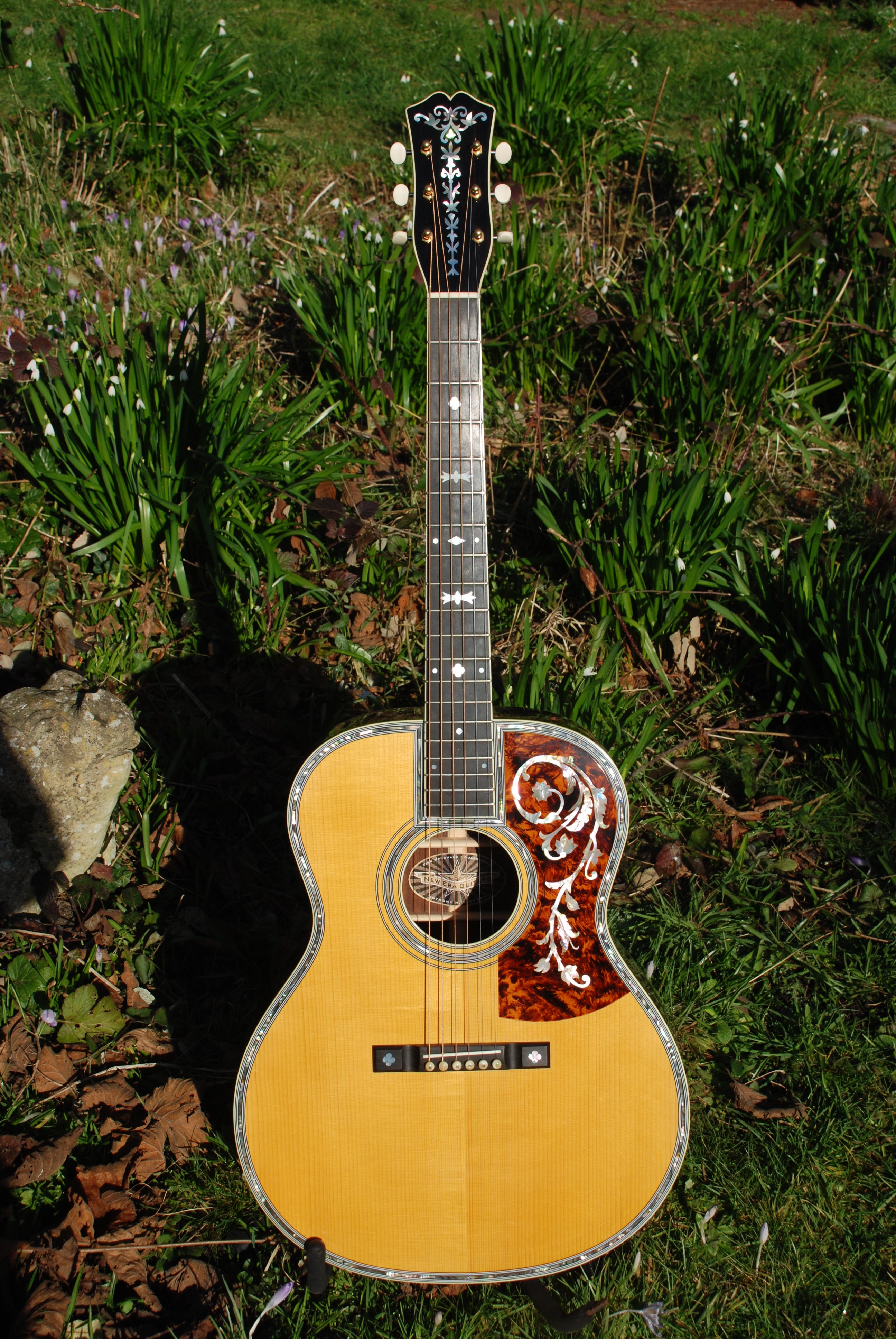 A custom "Euphonon" creation by New Era Guitars, owned and operated by Tony Klassen. who specifically set out to exactly reproduce the production models of the early guitar builders like Larson, Prairie State, Euphonon and Maurer. This 2012 Euphonon Deluxe is the highest state of the art. Cocobolo back and sides with an Adirondack spruce top and Larson style laminated X bracing in a jumbo sized body. Mahogany 3 piece neck with rosewood center and an ebony board and bridge. The headstock is veneered with ebony inlaid with tree of life pearloid and the pearl inlaid pickguard was custom built by renowned inlay artist Larry Robinson. It has a 25 1/2" long scale length with a 1 3/4" nut width, making it an exceptional sounding instrument. These new would be well over £12,000.ac Sadly, a few years ago Tony passed the divide, so they are not being made any more meaning it's a unique opportunity to get this model at a fabulous price. Very Larson-esque and extremely powerful, I don't think I've had a contemporary guitar in my hands that is as responsive as this is.......it's build quality and it's voice are why it now shows in a vintage guitar gallery, If you like pearl and like a tremendous sounding guitar.............well, it won't get better in a newer custom creation.